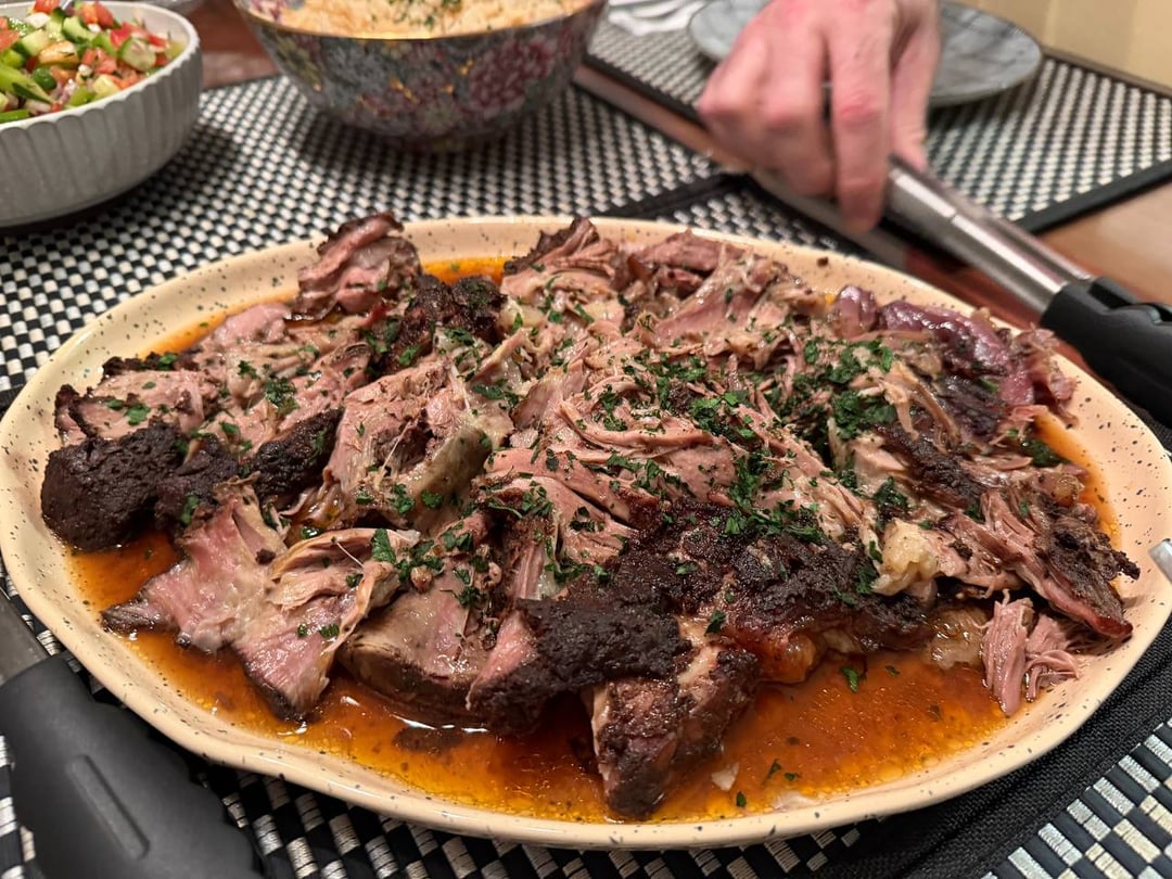 A hearty feast served family-style—tender roasted meat piled high alongside crispy golden potatoes, fresh tomato and onion salad, sautéed greens, and warm flatbread. A perfect spread for sharing and savoring every bite😋.