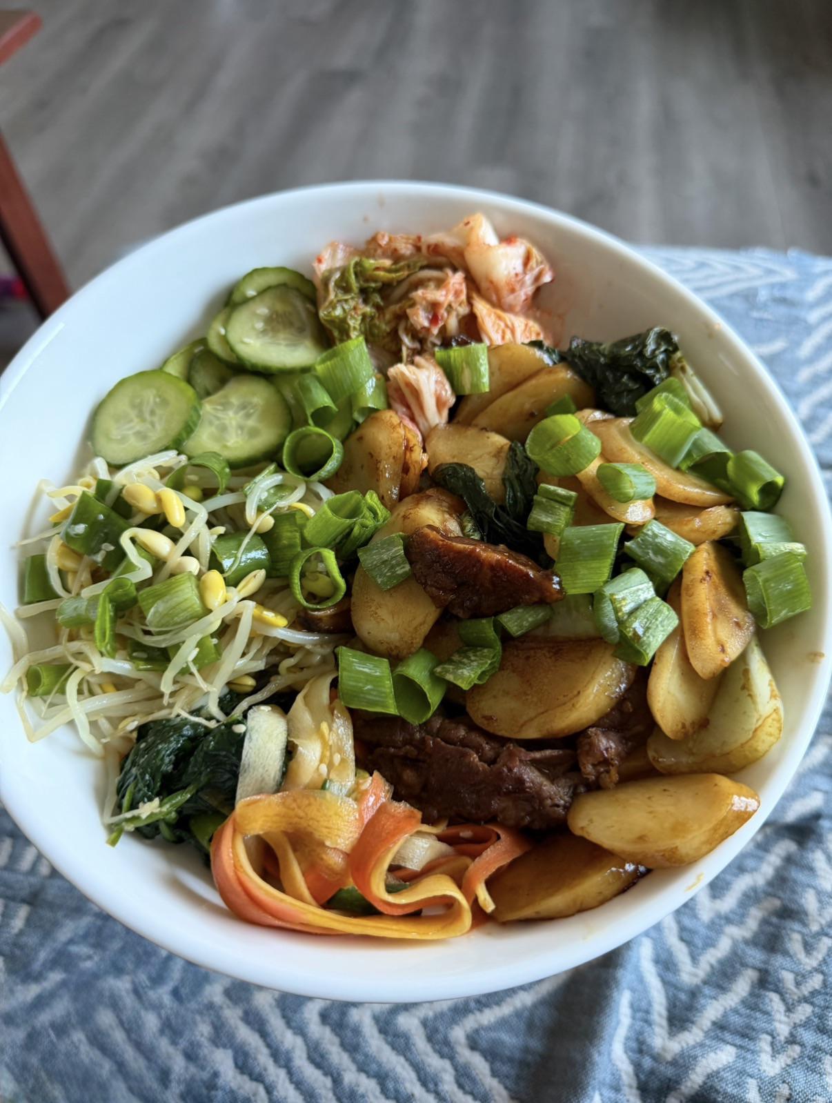 Stir-fried rice cakes, kimchi, bean sprout salad, cucumber salad, carrot salad, and spinach salad by cosmicplantlady Dinner Tonight Tonight's Dinner