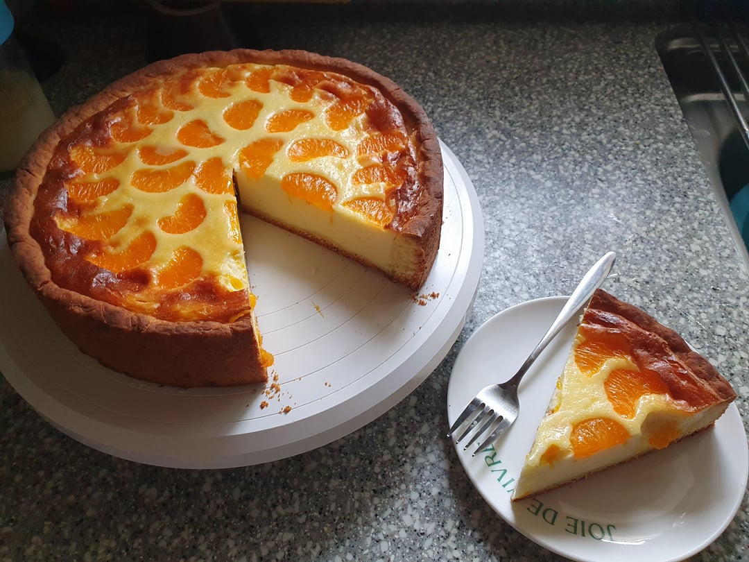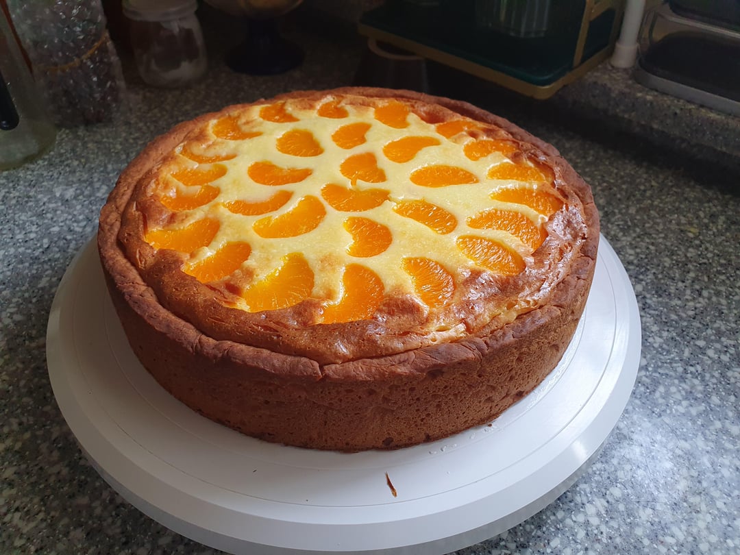 2. Add the mandarin and mix it gently. Then pour the mixture into a Yeast Base and placeing some mandarin over the top.