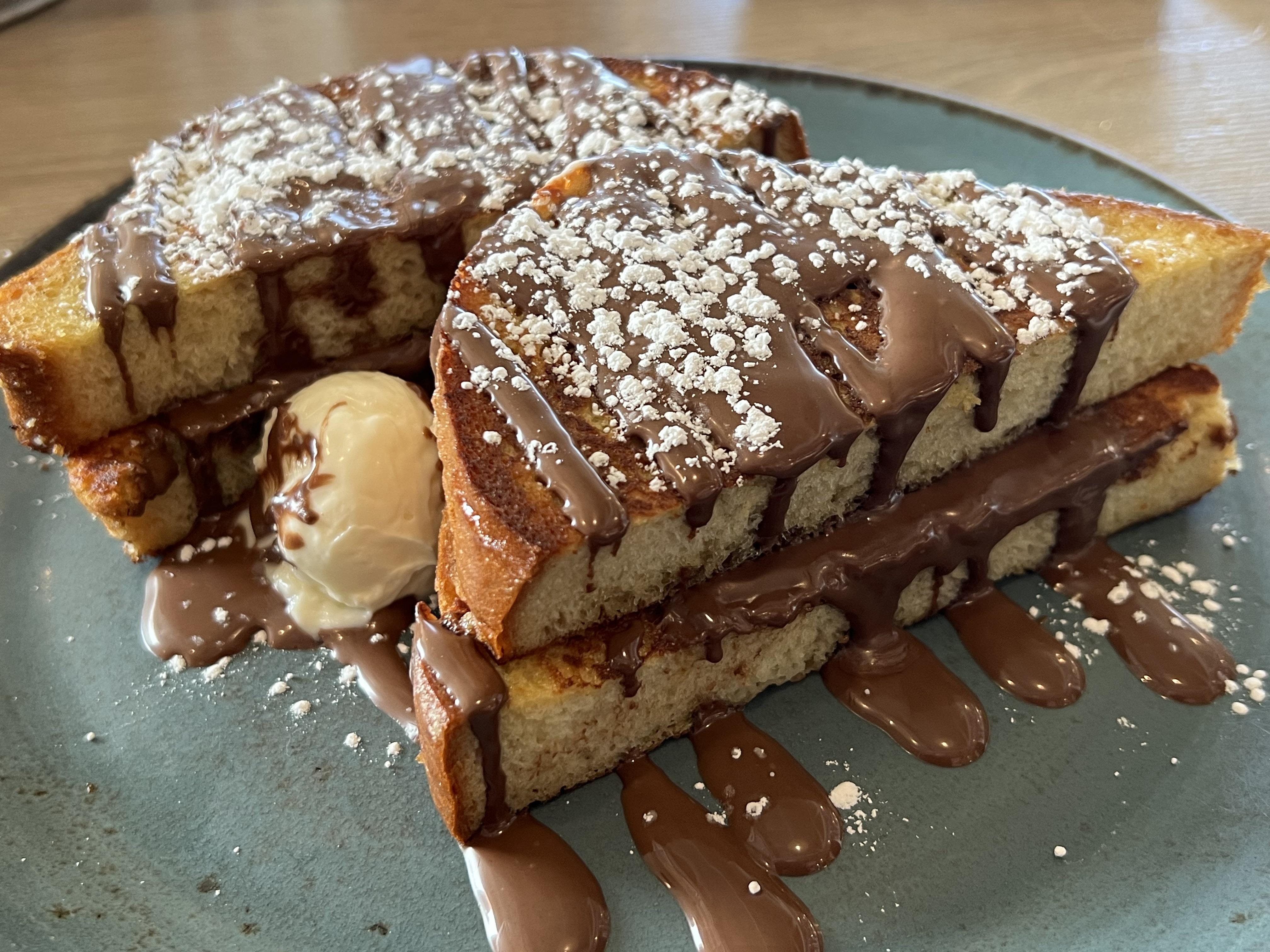 Nutella Stuffed French Toast: Honey Berry Pancakes and Café (HBPC) is a contemporary breakfast/lunch restaurant with 13 locations divided across WI, IL, and TX. I've dined there once before and was slightly disappointed by their pancakes, but I wanted to give them another chance with their French Toast. One criticism I have right off the bat is HBPC's menu offers descriptions of their different pancake varieties, but no descriptions are provided for their French Toast, which led me to asking our server more questions than I'd prefer to. There ended up not being a type of French Toast available on the menu that was exactly what, but our server did allow the modifications I requested, which brings us to my Nutella Stuffed French Toast (which should be a regular menu item). I got two large pieces of brioche French Toast dusted with powdered sugar and lathered in and stuffed with sweet Nutella. My taste buds were rejoicing from the combination of chocolate, hazelnut, butter, and hints of eggs. The French Toast was warm, perfectly crispy on the outside, pleasantly chewy, and incredibly thick (I actually struggled cutting it). It was precisely what I was hankering for and really hit the spot! I saved half for dinner at home and enjoyed it even more as chilling it in the fridge did wonders for the texture. Doughboy approved 😋