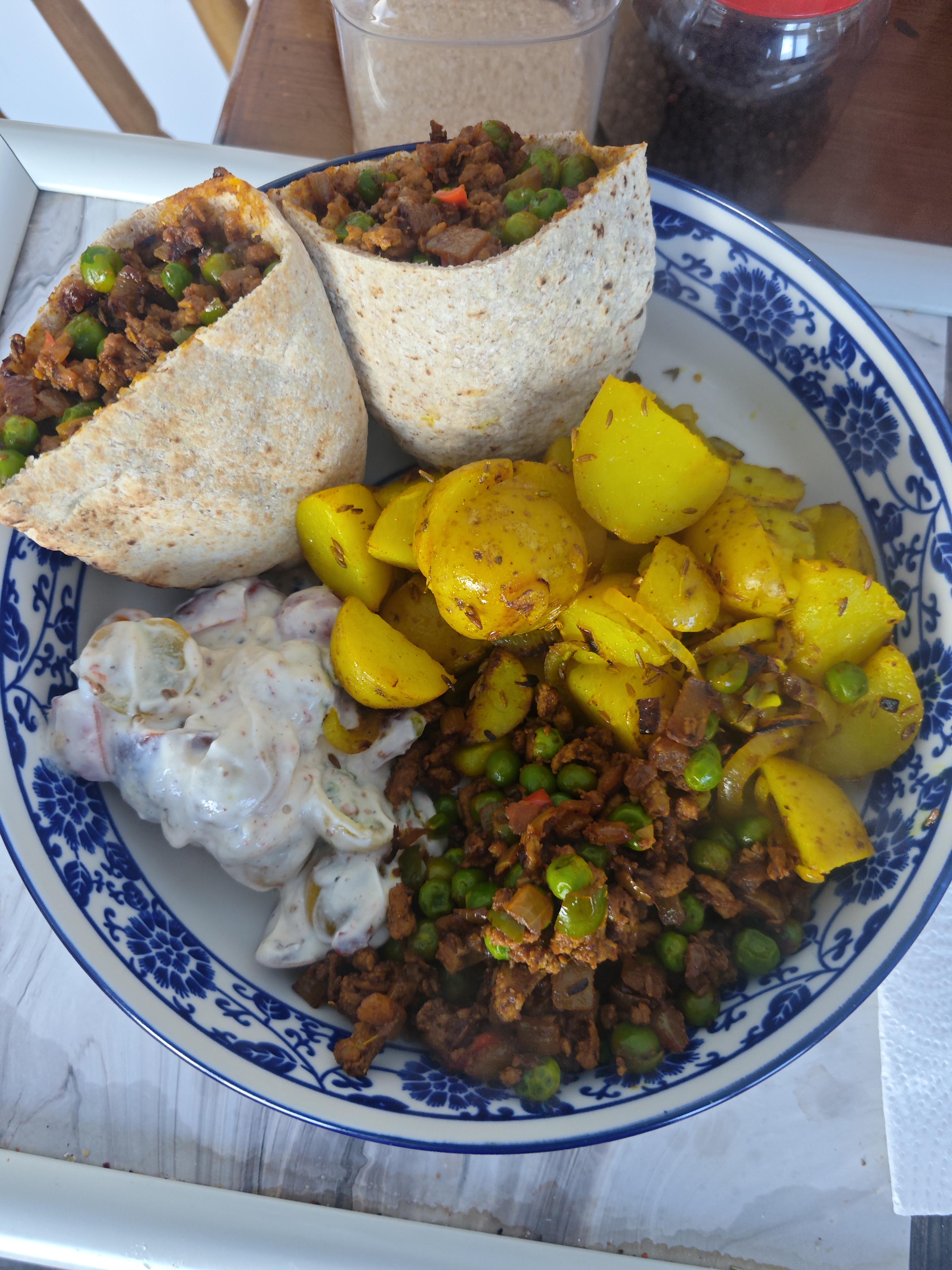 Heart Healthy Spiced Turkey Keema Pita with Turmeric-Cumin Potatoes and Yoghurt Tomato Salad by bertieboy777 Food Porn