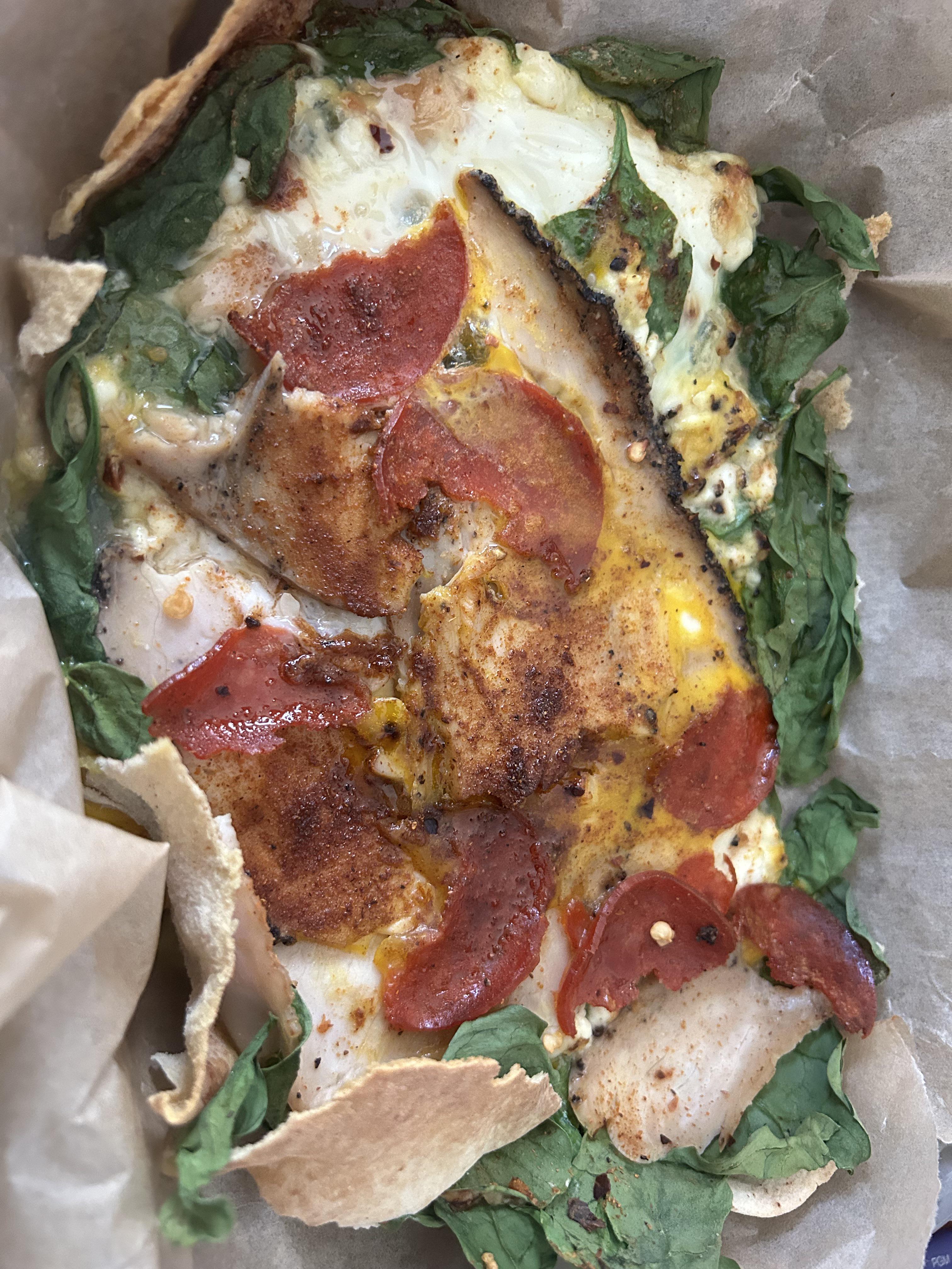 I lined an old meal kit tray with parchment paper, and covered the bottom and sides with sliced up half pita (80 calories, 3 G protein), handful of spinach (10. Calories, 1 G protein), r tbsp low fat cottage cheese mixed with half tablespoon nutritional yeast, everything seasoning, and red pepper (50 calories 7 G protein) , topped with two eggs (150 calories, 12 G protein), shredded deli turkey slice (30 calories, 5 grams protein), 6 slices hormel turkey pepperoni, halved (30 calories, 3 G protein), plus paprika, black pepper, and more red pepper (I like it spicy), and even a half tsp maple drizzle as a treat (10 calories).