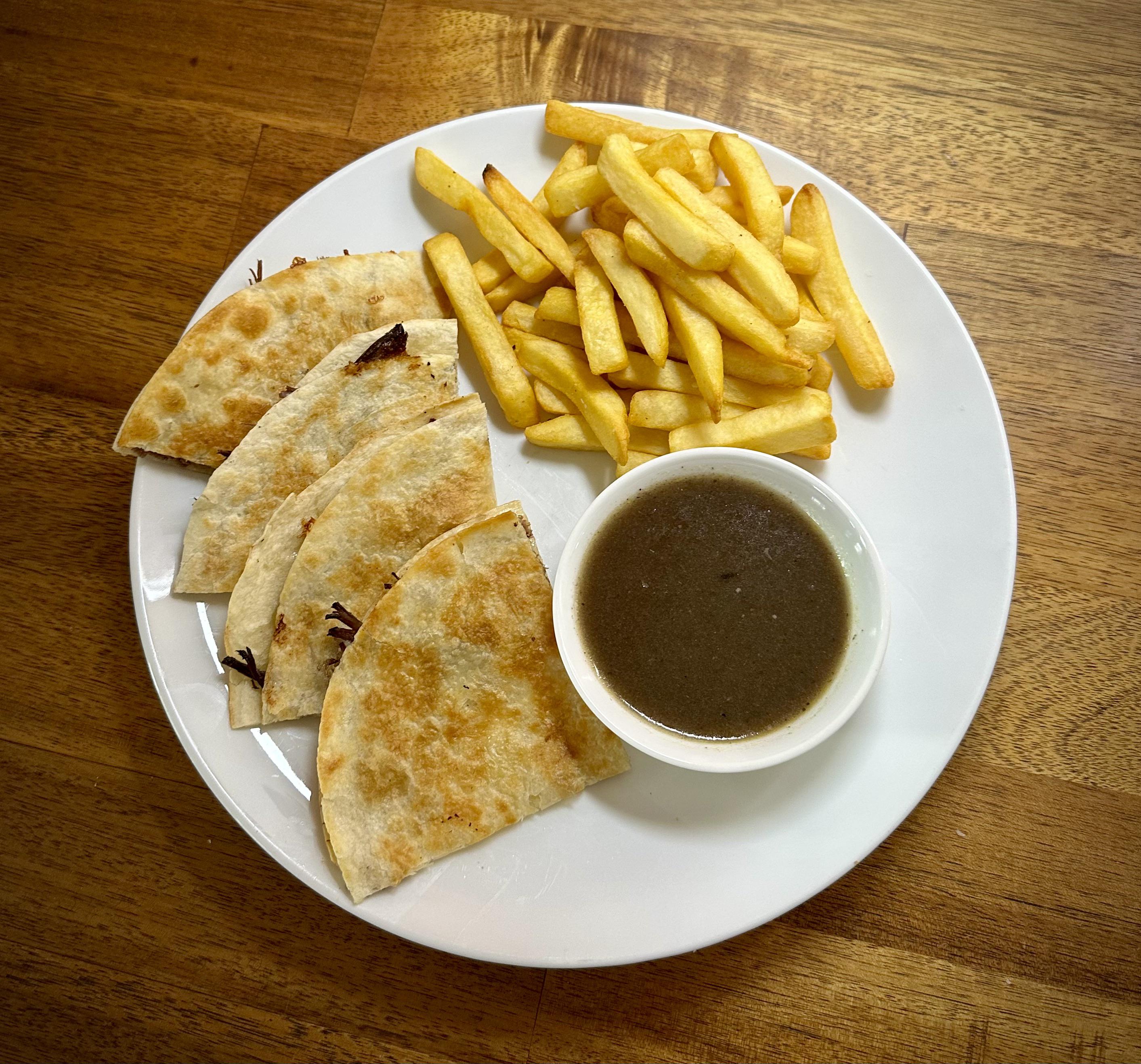 Made Beef & Cheese Quesadillas with Leftover Pot Roast and AuJus plus Fries by dentalexaminer Dinner Tonight Tonight's Dinner