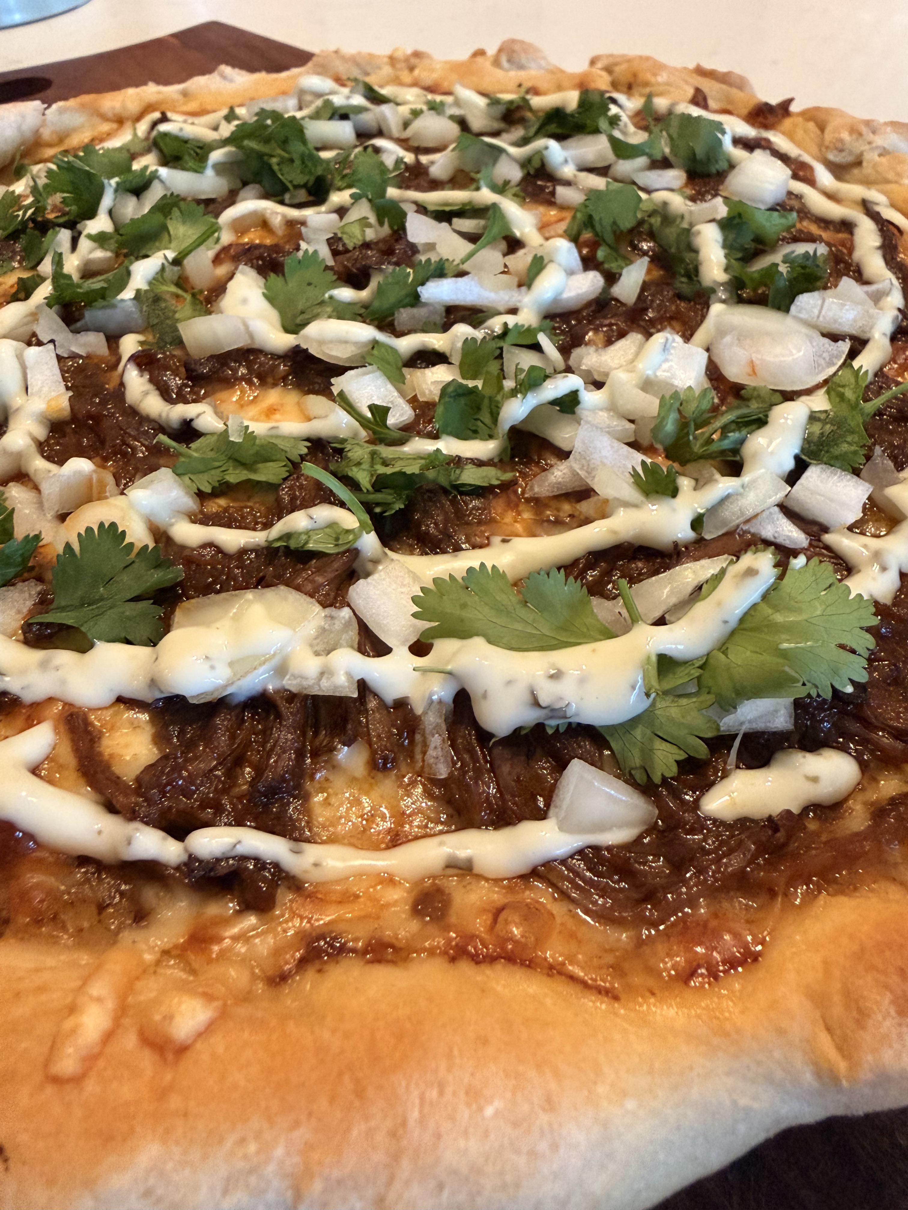 Homemade sourdough discard pizza crust, the base is a bit of consume with mozzarella and leftover birria meat. Topped with onions and cilantro and a drizzle of cilantro crema🤤