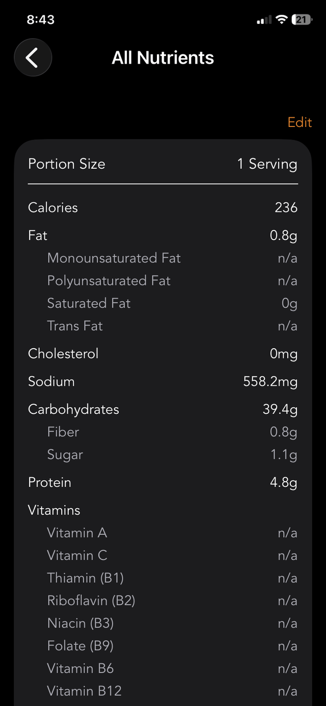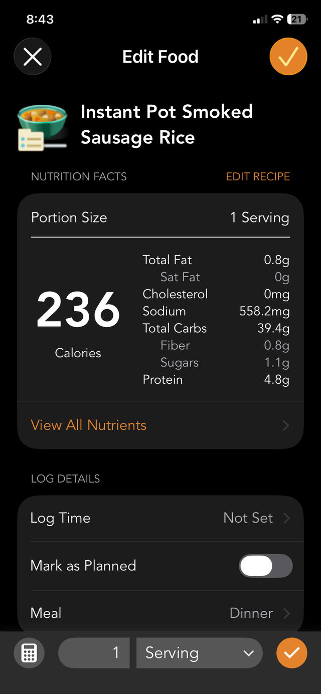 This recipe yields 4 servings of around 1.5 cups. The serving size pictured is 1 of 4 servings logged in the LoseIt app.