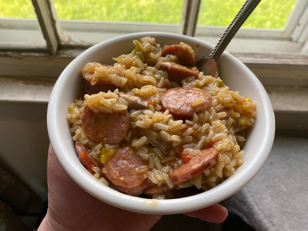 Chop up the smoked sausage. Set the instant pot on sauté on high, sauté the smoked sausage and mushrooms until a little cooked around the edges, deglaze the bottom of the pan using the beef consommé (The sauté and deglazing steps can be skipped to save a little more energy, but it's worth it for the extra depth of flavor). Add in all the other ingredients, stir, and set to pressure cook on high for 5 minutes. After that, let it slow release for 10 minutes, then release the pressure the rest of the way.