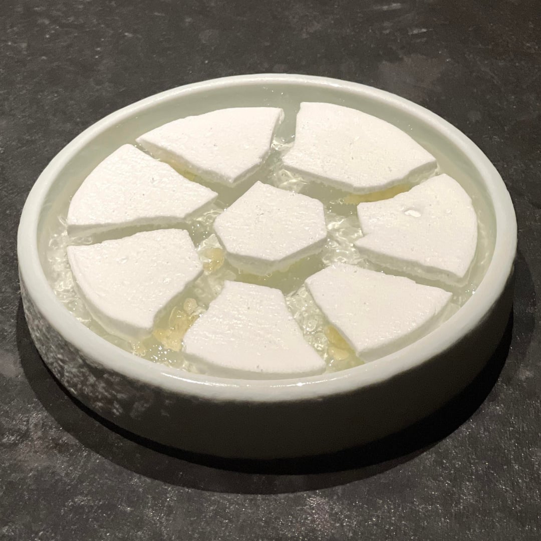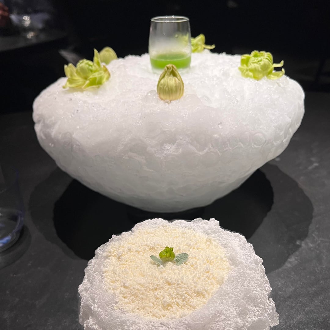 Notwithstanding the impressive showpieces, the highlight of the night for me was actually a pre-dessert of meringue wafers laid on top of clear almond-flavoured jelly, made to resemble the ice sheets breaking up in early spring. Hidden from view are pieces of popping candy which creates an audible cracking sound befitting of the theme. Most immersive dining experiences I’ve been to would have used pre-recorded sound, some even make you wear headphones to maximise the effect. This one however provides just the right amount of acoustic stimulation using edible ingredients itself, elegant and efficacious.