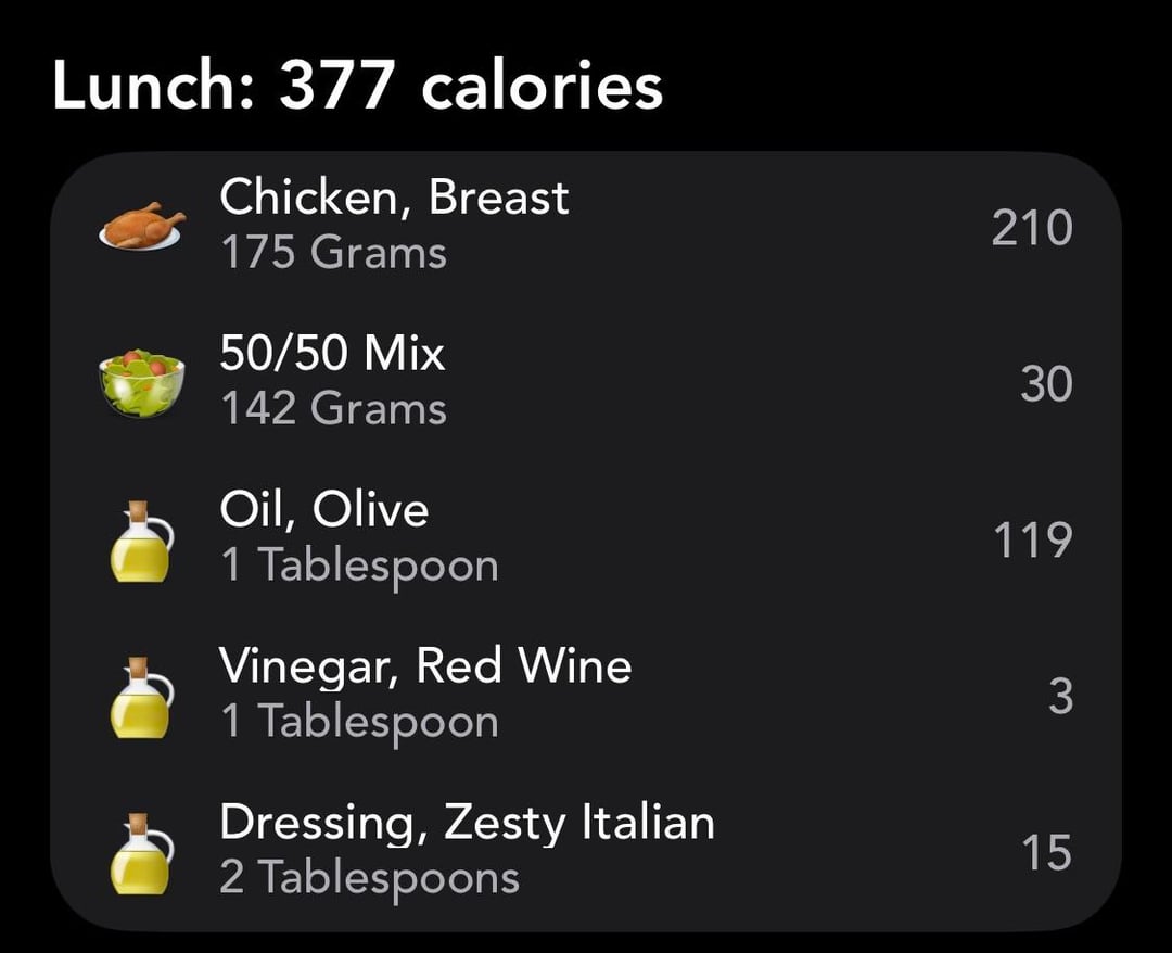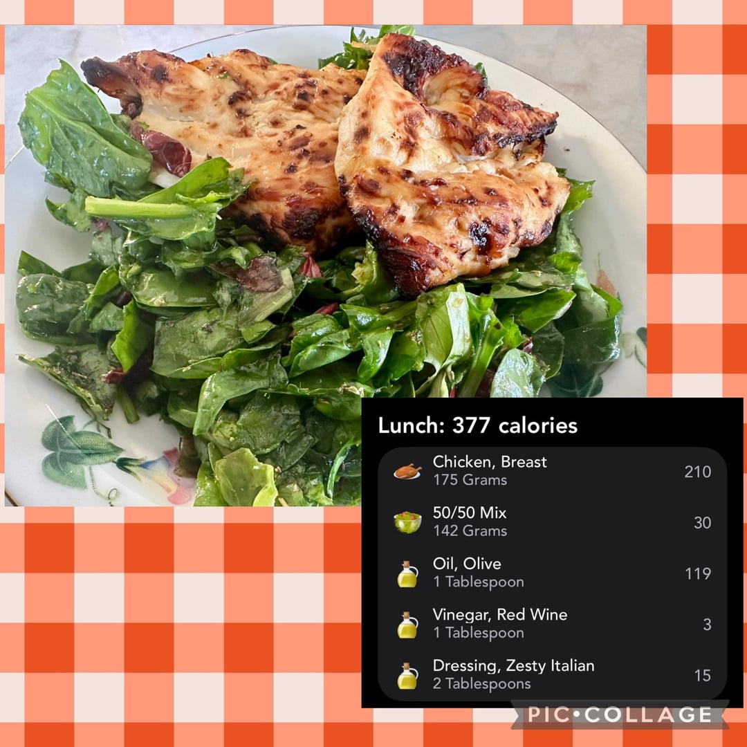 The chicken breast was marinated in the fat-free zesty Italian and a little bit of water in the fridge for an hour or so and then put in the air fryer at 380 Fahrenheit for about 16 minutes. The dressing on the salad was just a little bit of olive oil, oil vinegar, oregano, salt, and pepper and a splash of lemon juice.