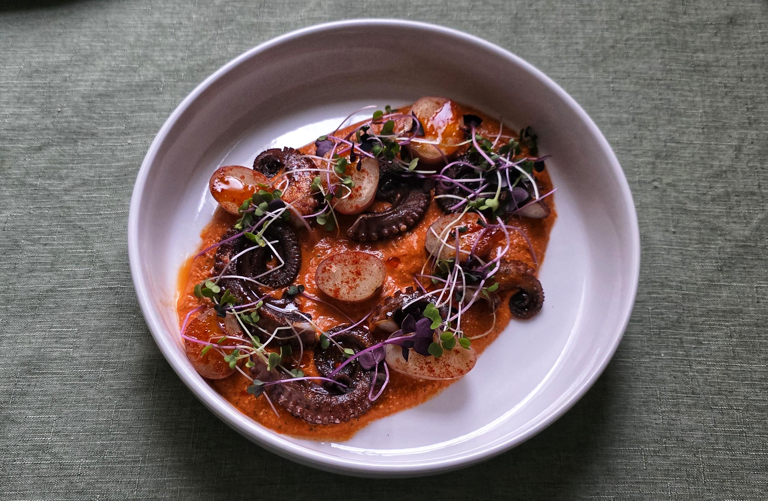 The octopus was simply simmered in water with bay leaves and half an onion for about 40 minutes before refrigerating overnight and searing on a cast iron pan. The baby potatoes were boiled in the octopus water. The romesco sauce was 1 can of fire-roasted tomatoes, 1 jar of roasted peppers, a handful blanched almonds, parsley, olive oil, sherry vinegar, pimentón, garlic, and salt—all blended together until smooth. And finally, the pimentón de la Vera oil was some olive oil heated up with garlic, before taking it off the heat, and then adding in some pimentón de la Vera (Spanish smoked paprika). Let it infuse for an hour before filtering it through a coffee filter. And finally—put everything together, and sprinkle with some extra pimentón de la Vera and flaky salt.