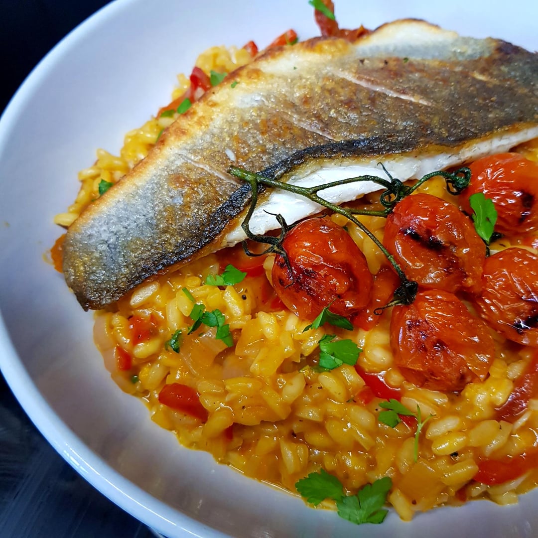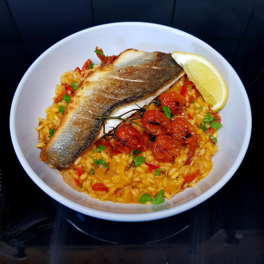My Own Creation Based on Med Seafood Soup – Pan Fried Sea Bass with Sundried Tomato, Orange and Chilli Risotto. Finished with Blistered Vine Tomatoes and Parsley.