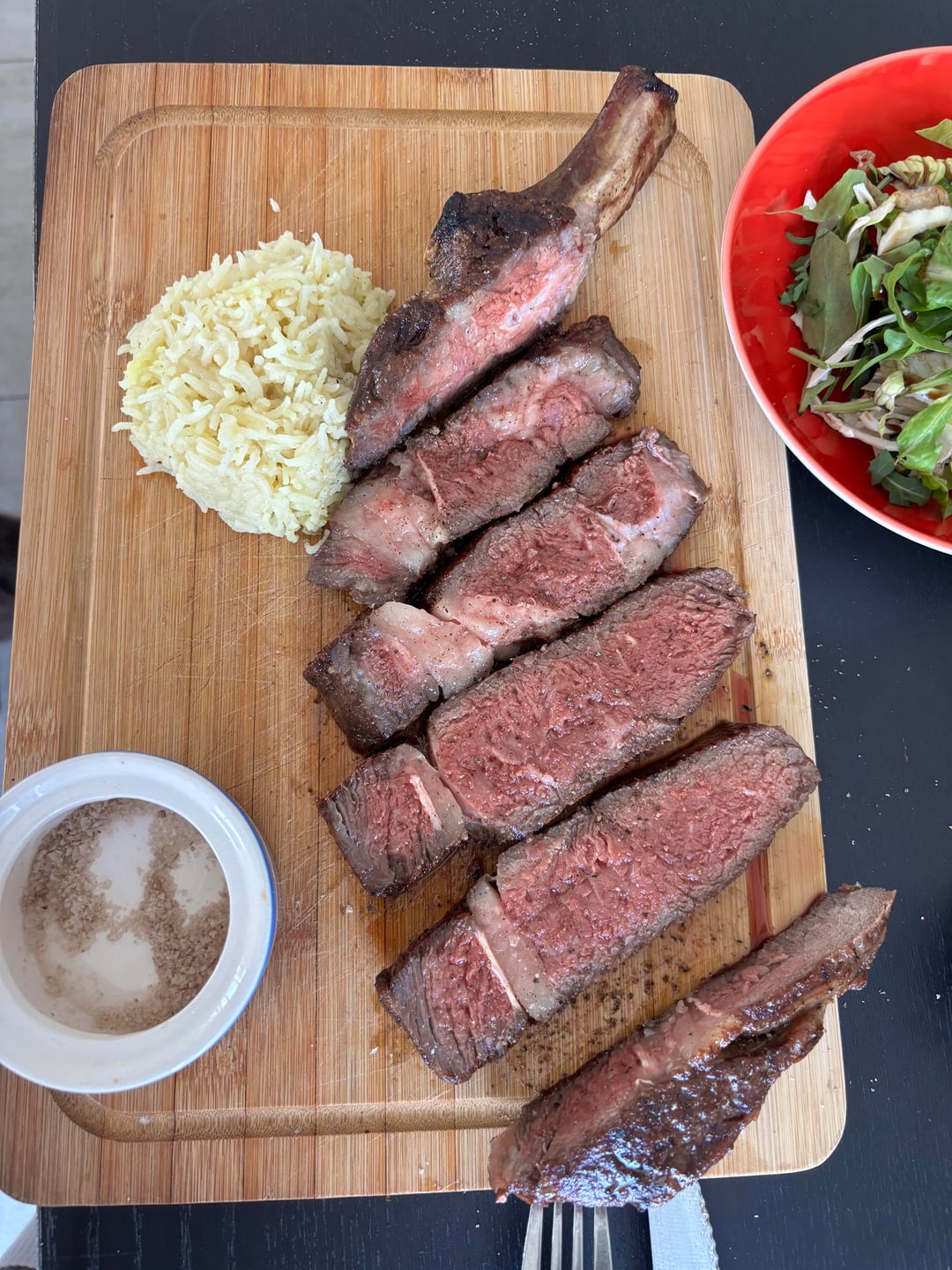 My Own Creation Based on Med Seafood Soup – Pan Fried Sea Bass with Sundried Tomato, Orange and Chilli Risotto. Finished with Blistered Vine Tomatoes and Parsley.