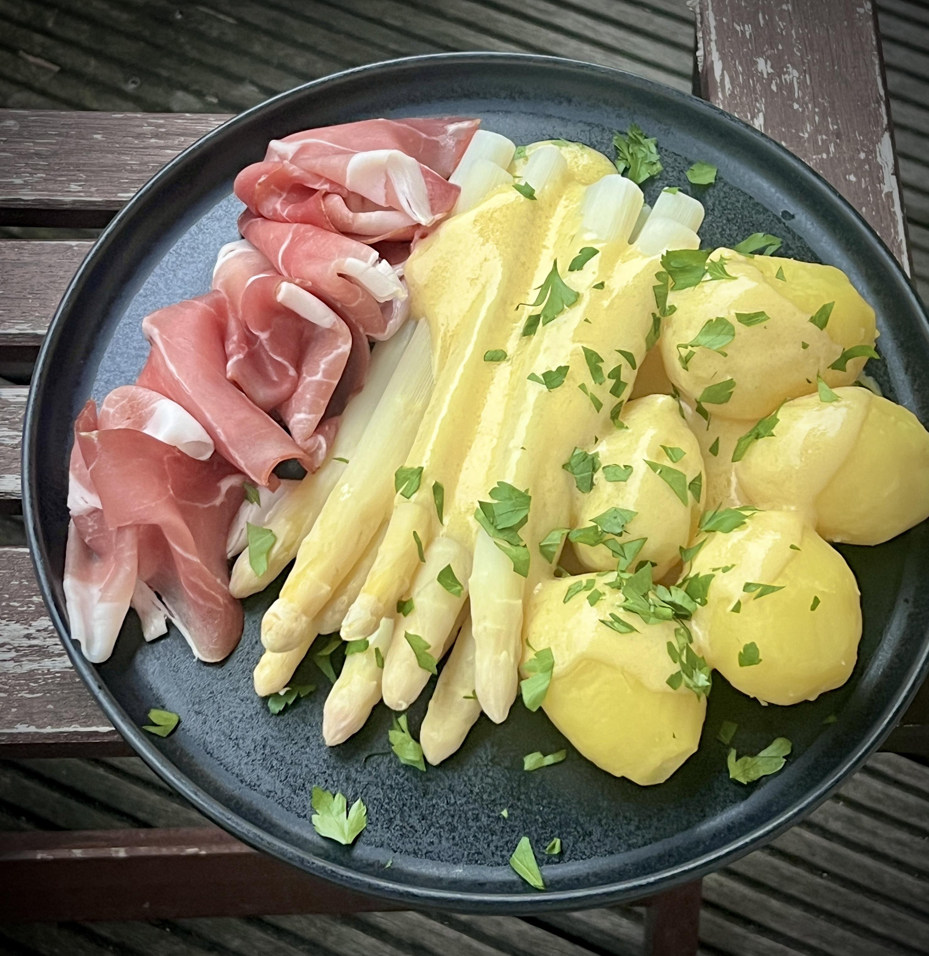 hansebart on April 25, 2026 6:44 pm A classic german dish. White asparagus, potatos, Black Forest Ham, and Sauce Hollandaise.