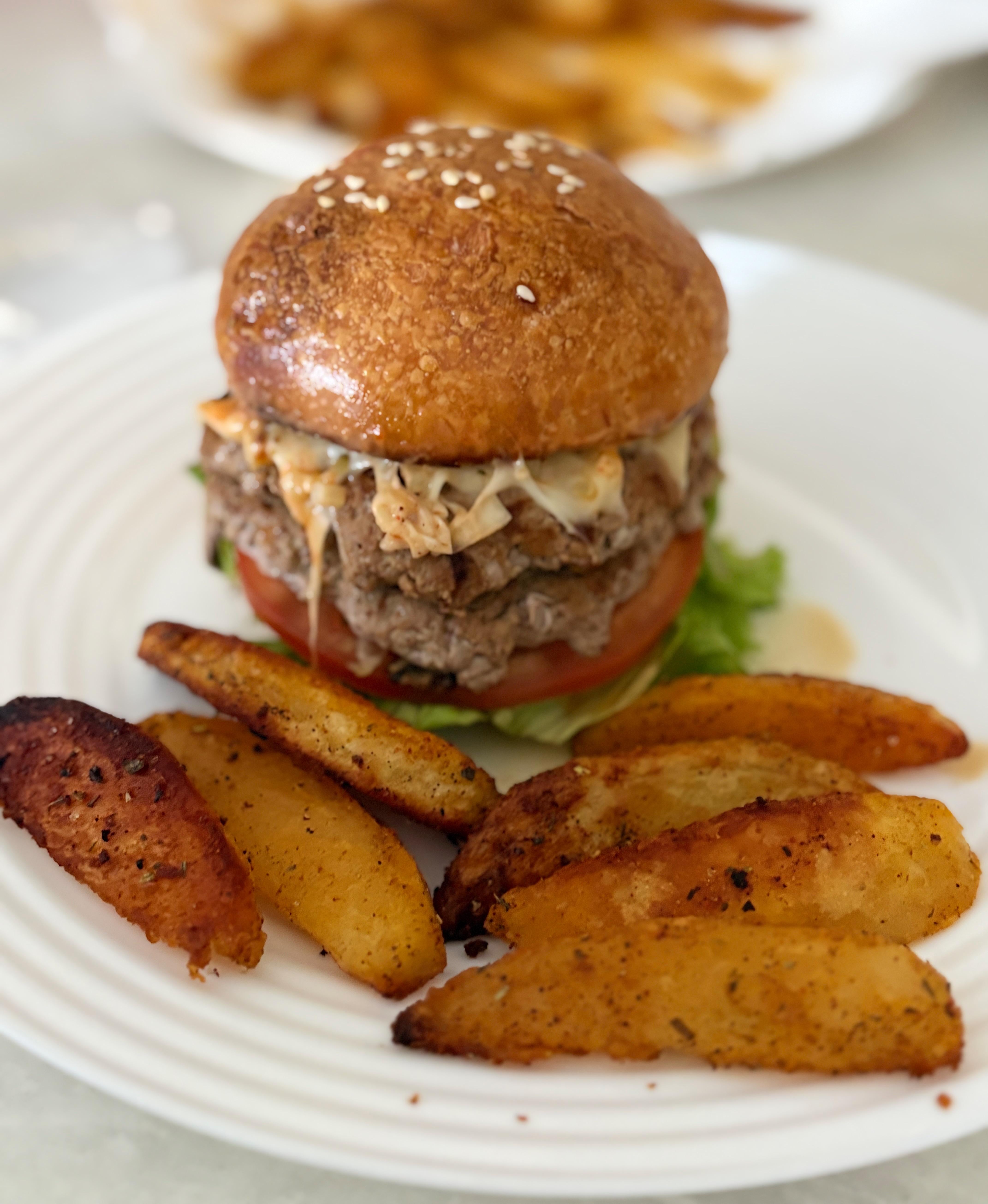 burger with homemade sourdough buns and potato wedges.