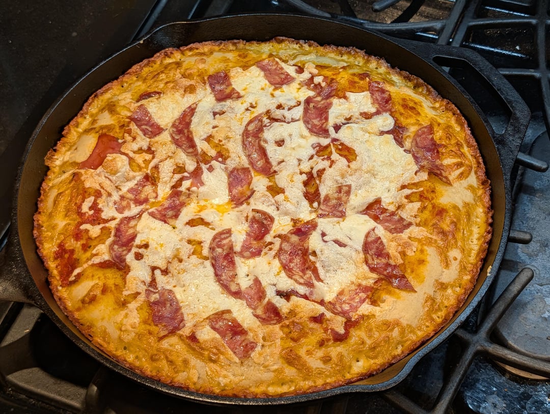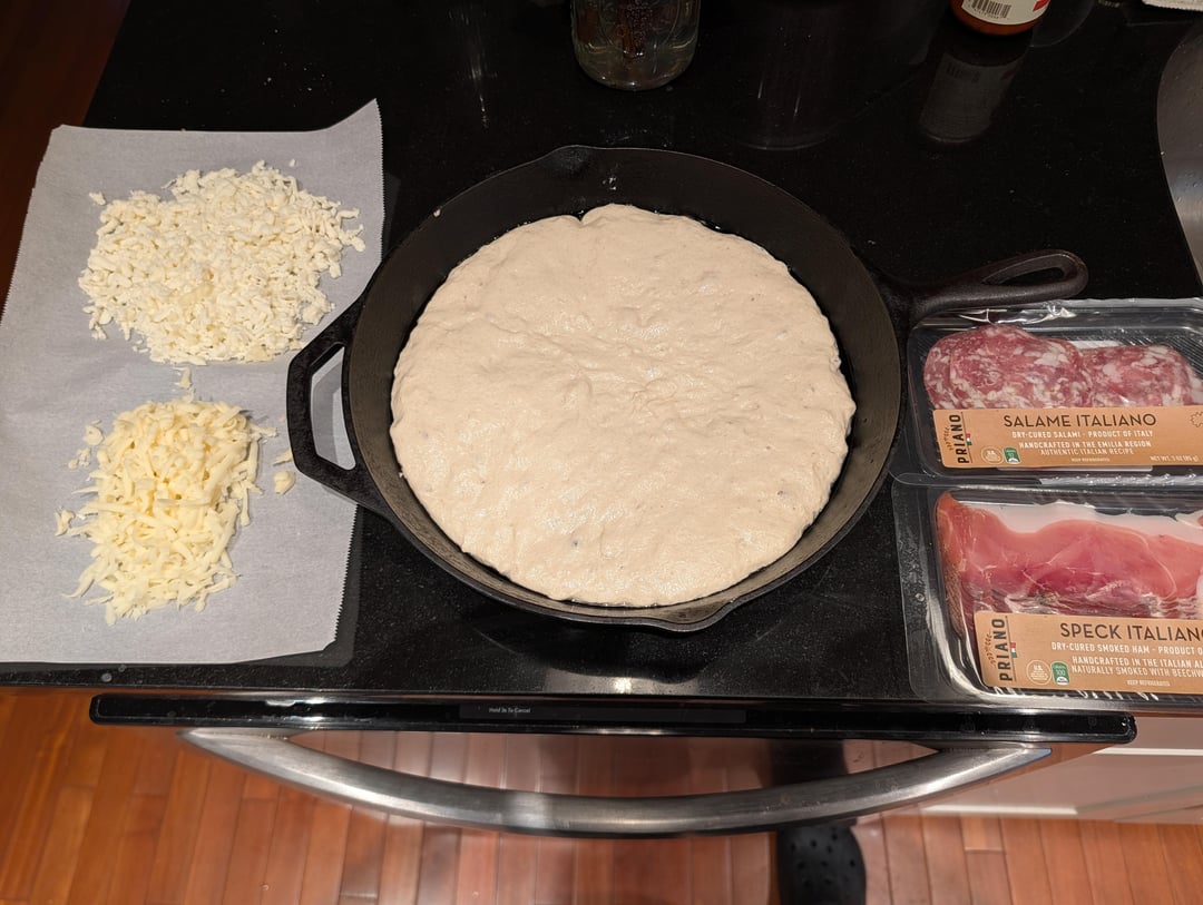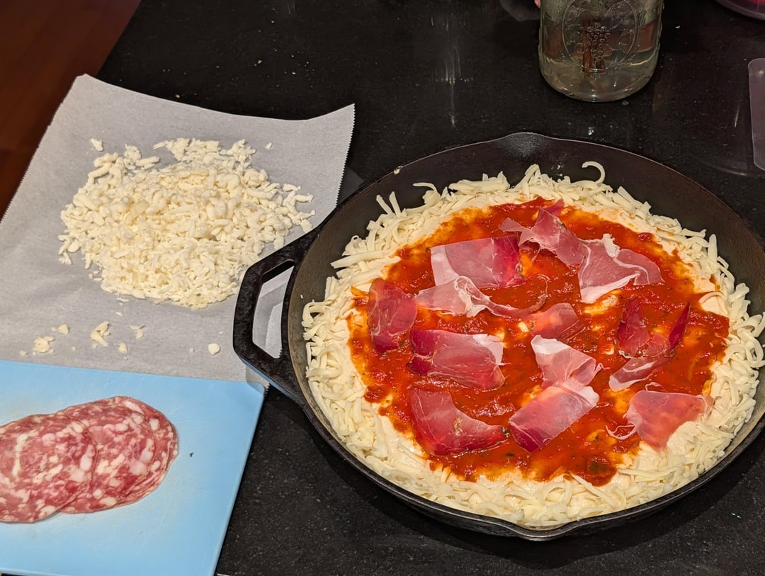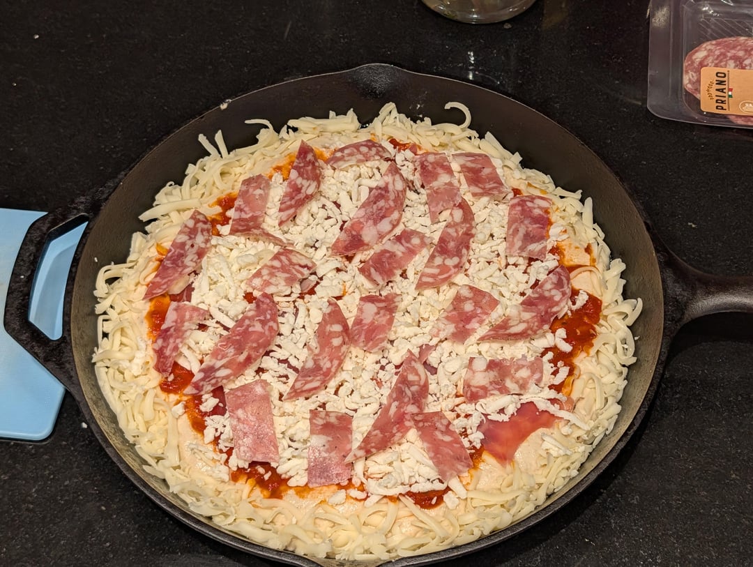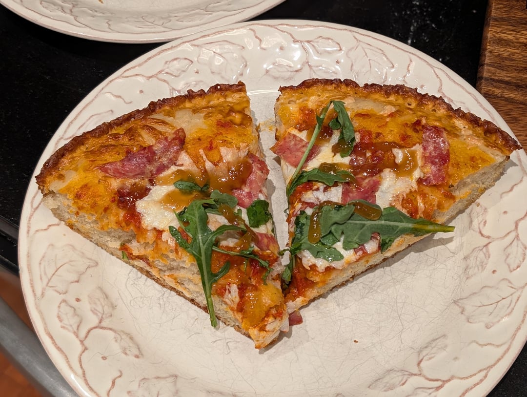 Pan Pizza with speck, salami, arugula, and hot honey