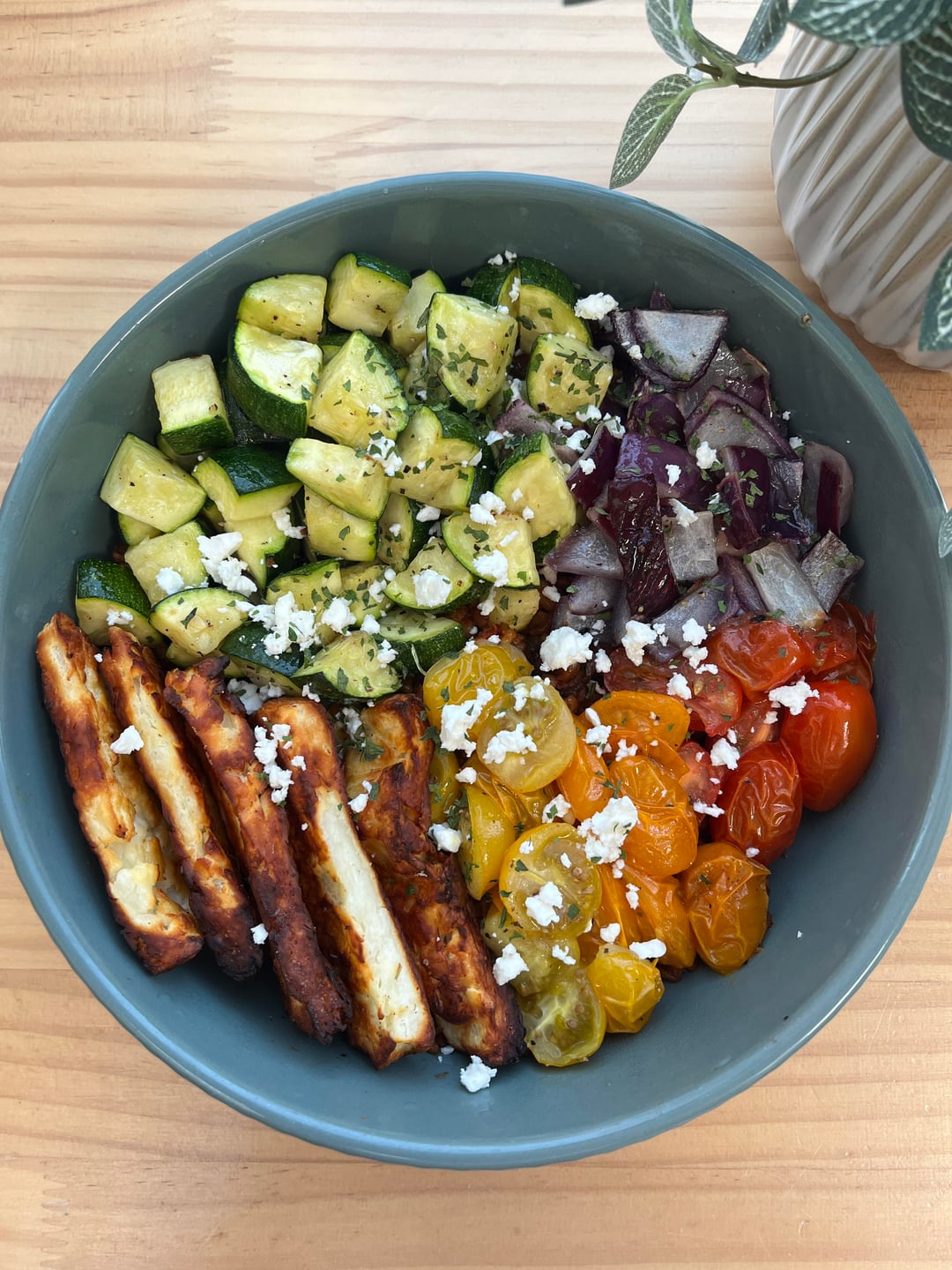 * halloumi bowl with grains and roasted veg