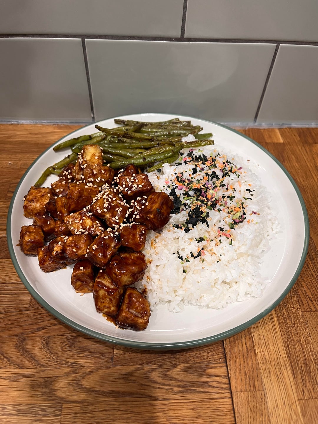 * crispy teriyaki tofu with rice and green beans