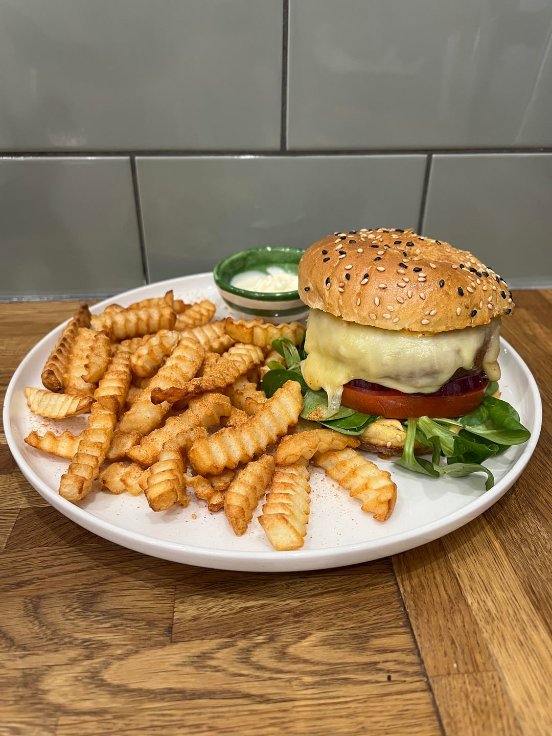 * beyond meat burger with crinkle cut chips