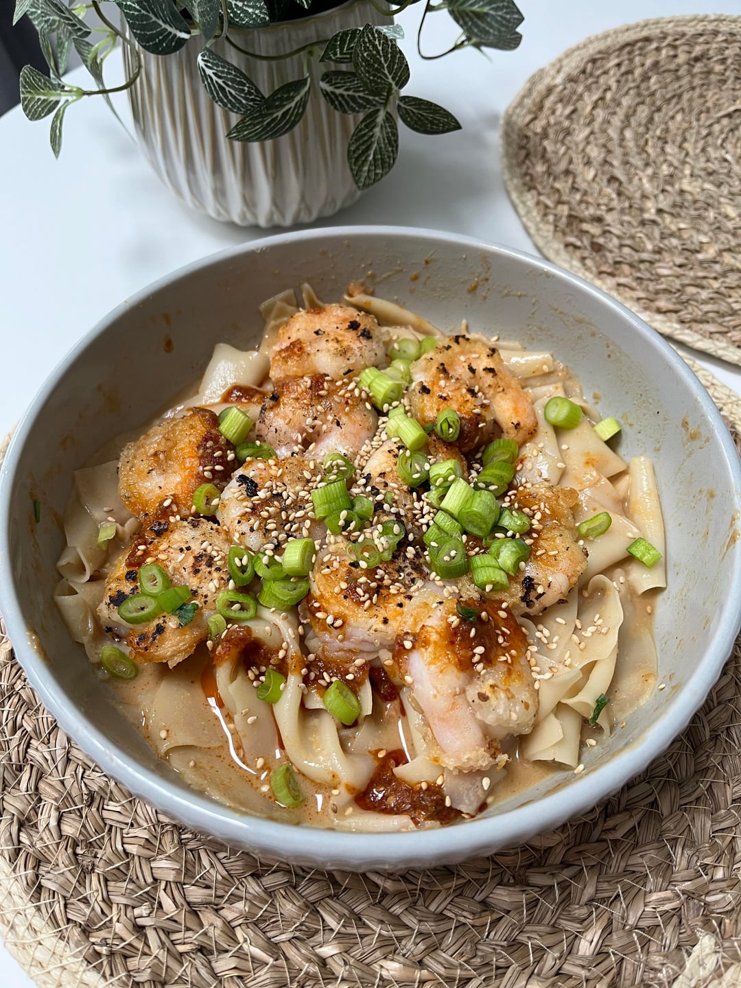* dumpling wrapper pulled noodles with a peanut butter sauce, prawns, green onion, sesame seeds, and chilli