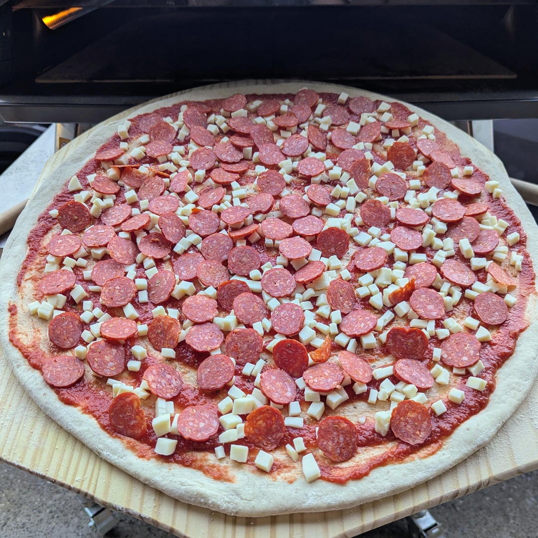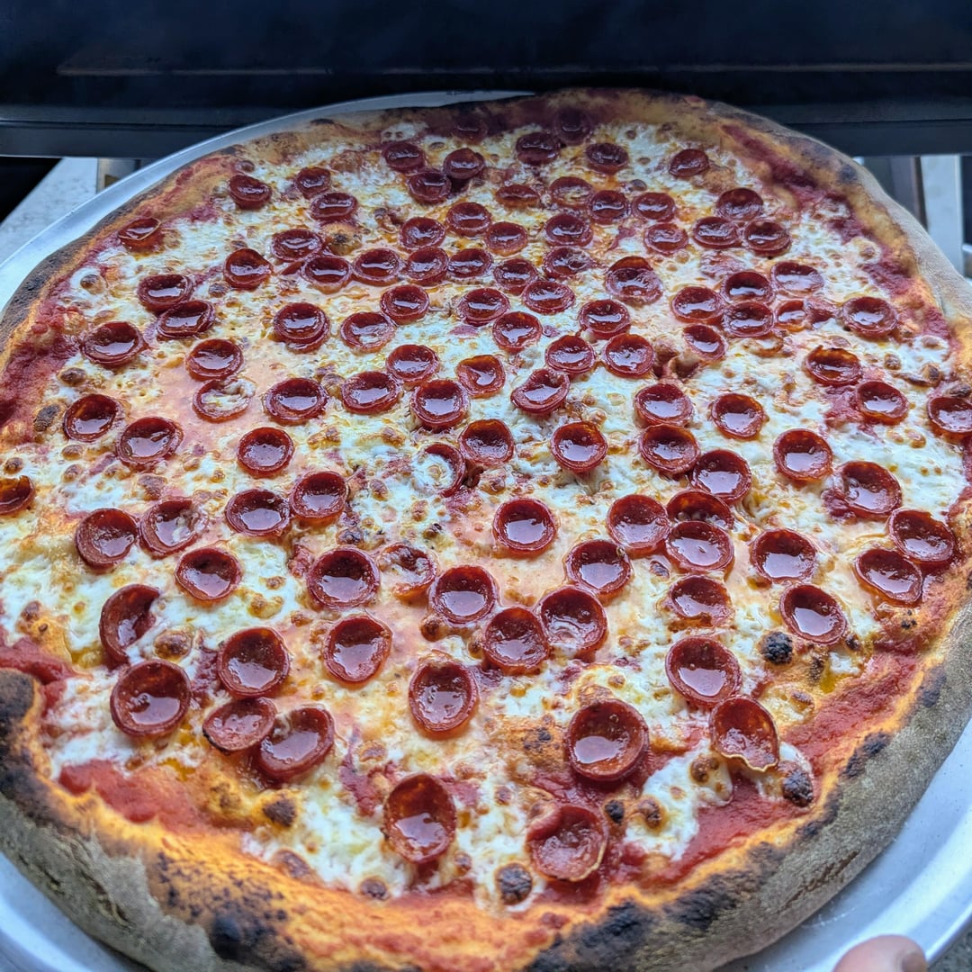 We had a pizza party for the neighborhood kids so I played the hits. 20" pepperoni, 20" cheese and some bread sticks. 62% hydration with a 72 hour cold ferment on all of them. Only had time to photograph this one! by iheartbicycles Food