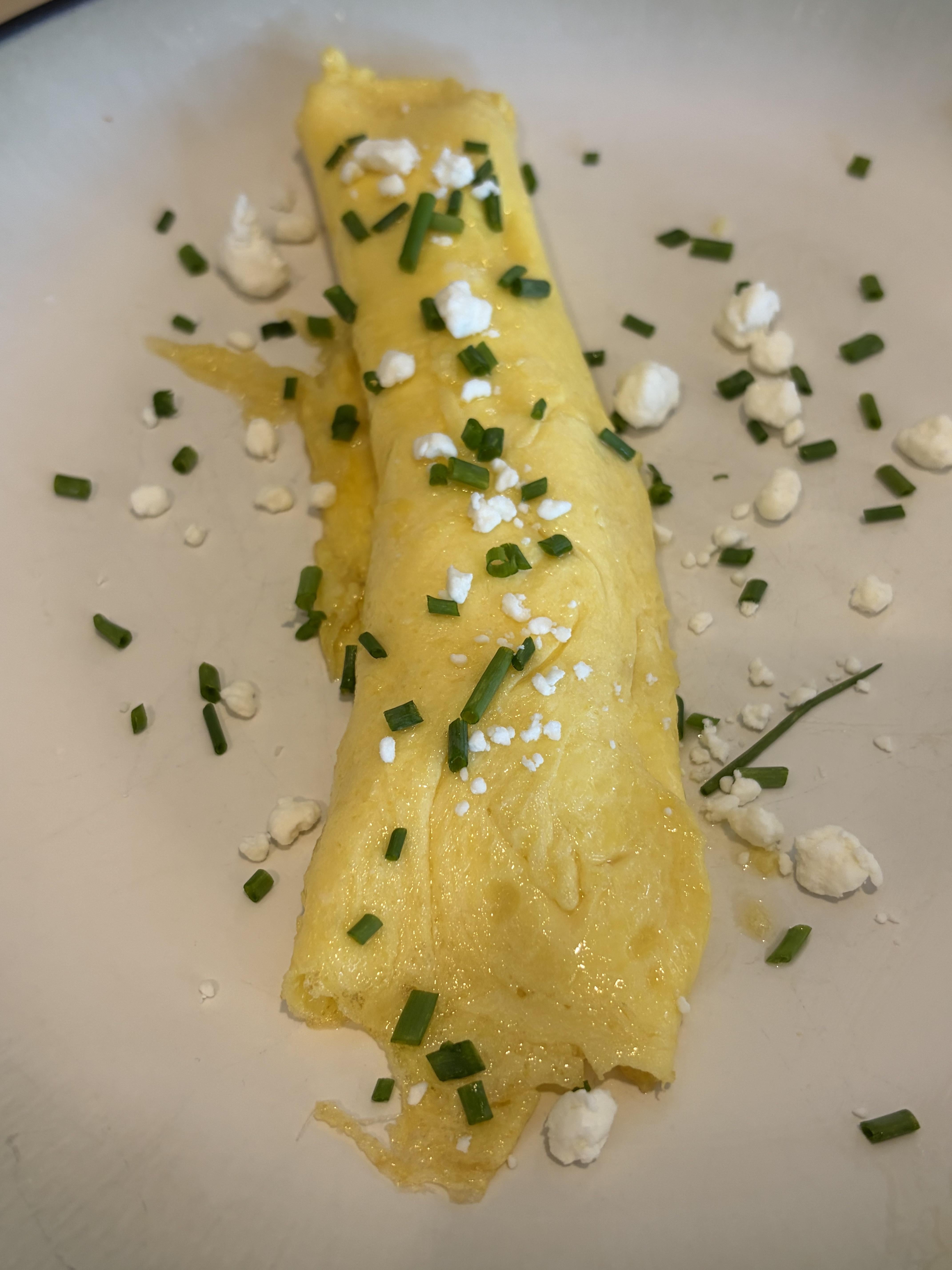 Tuck the ends of the sides in a little bit and Tuck the ends underneath for better presentation and that also is part and parcel of a French omelette. That’s part of what makes it a French omelet is its torpedo or almond shape. Better plating would have brought this to a 9.