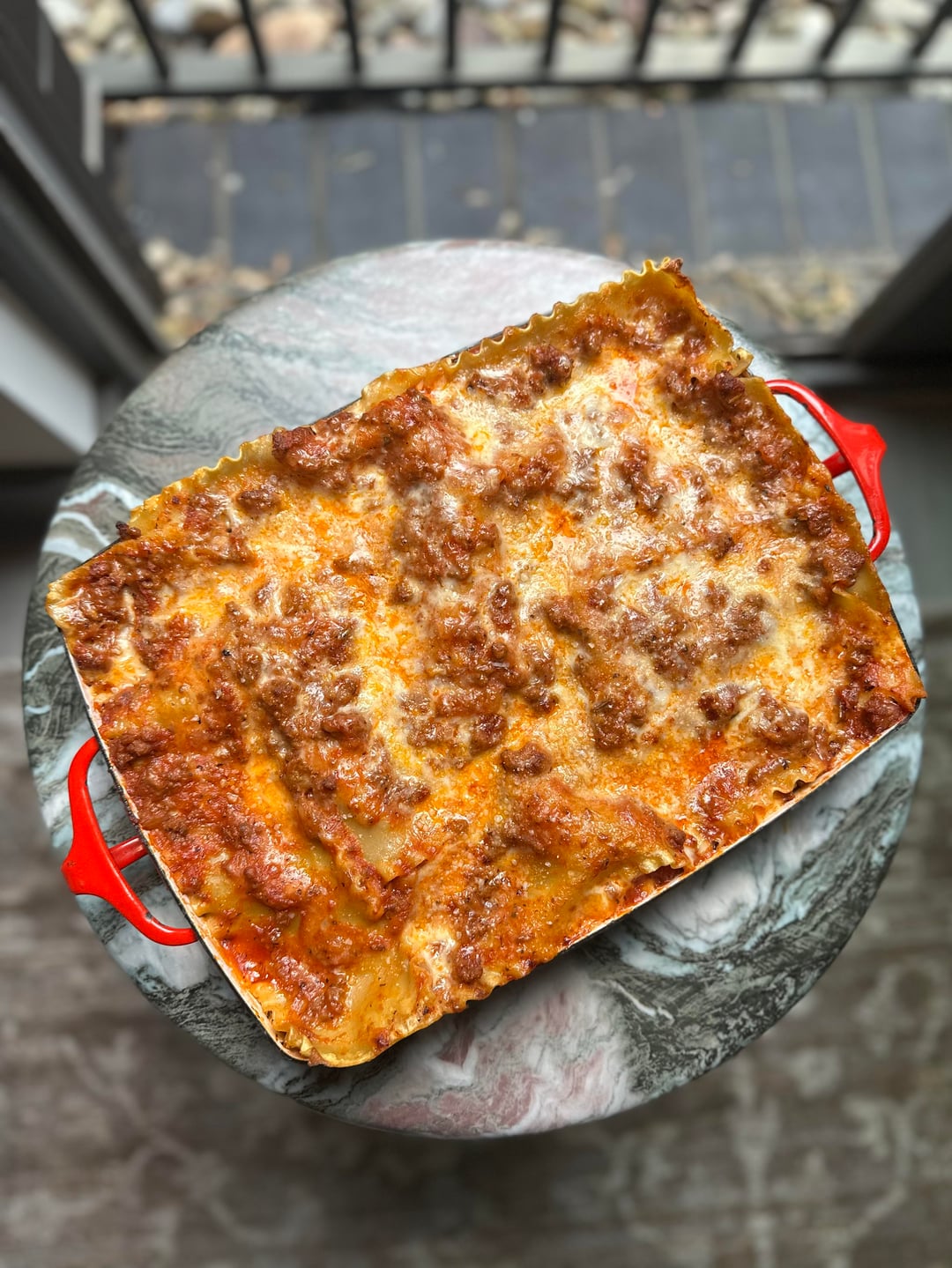 In a lasagna pan, start with a small amount of sauce, add a layer of noodles, a layer of ricotta, and then sprinkle a layer of shredded mozzarella. Repeat these steps until you get to the last layer of sauce. Top with lots of Parmesan and mozzarella. Cover with foil and bake for 45 mins.