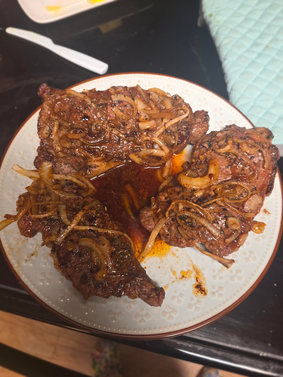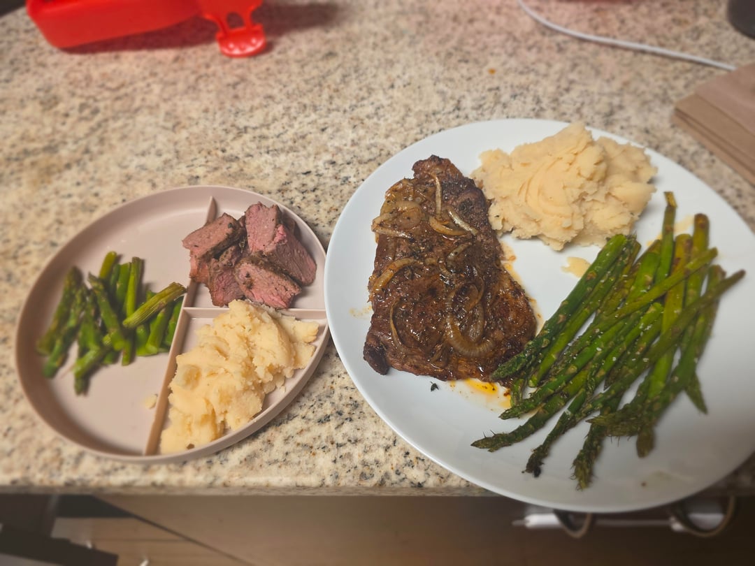 My daughter and I’s plates tonight. She gets NY Strip i got Ribeye, with a side of mashed potatoes and baked asparagus