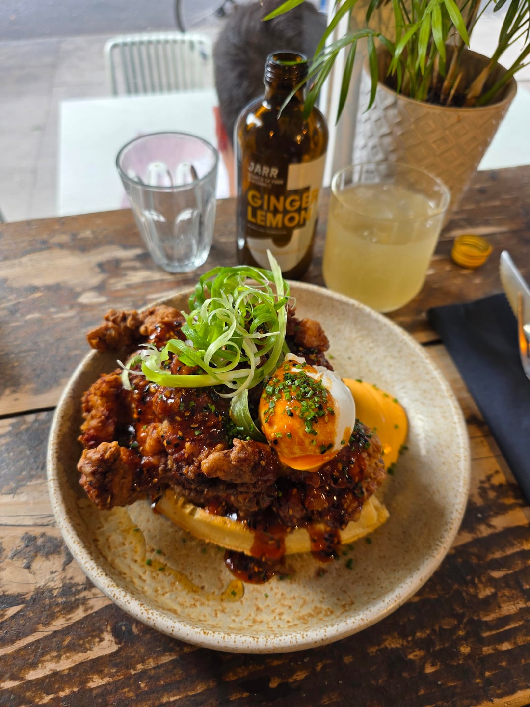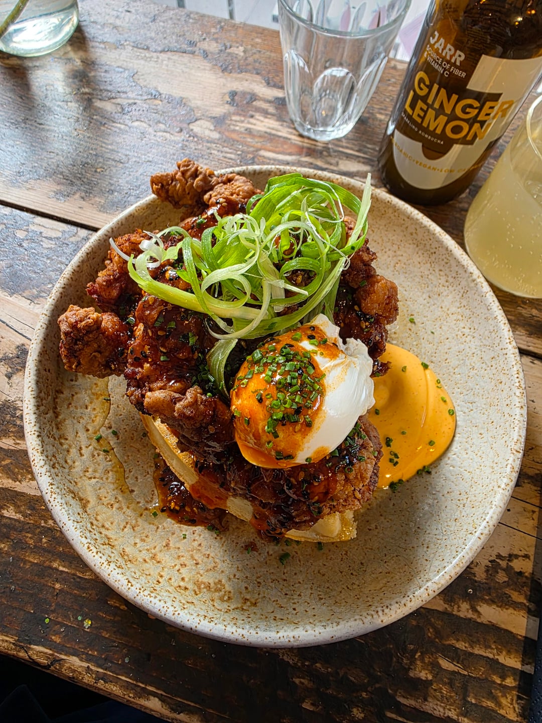 [I Ate] Fried Chicken and waffles with Gochujang sauce, topped with a poached egg. Half Cup, Kings Cross, London