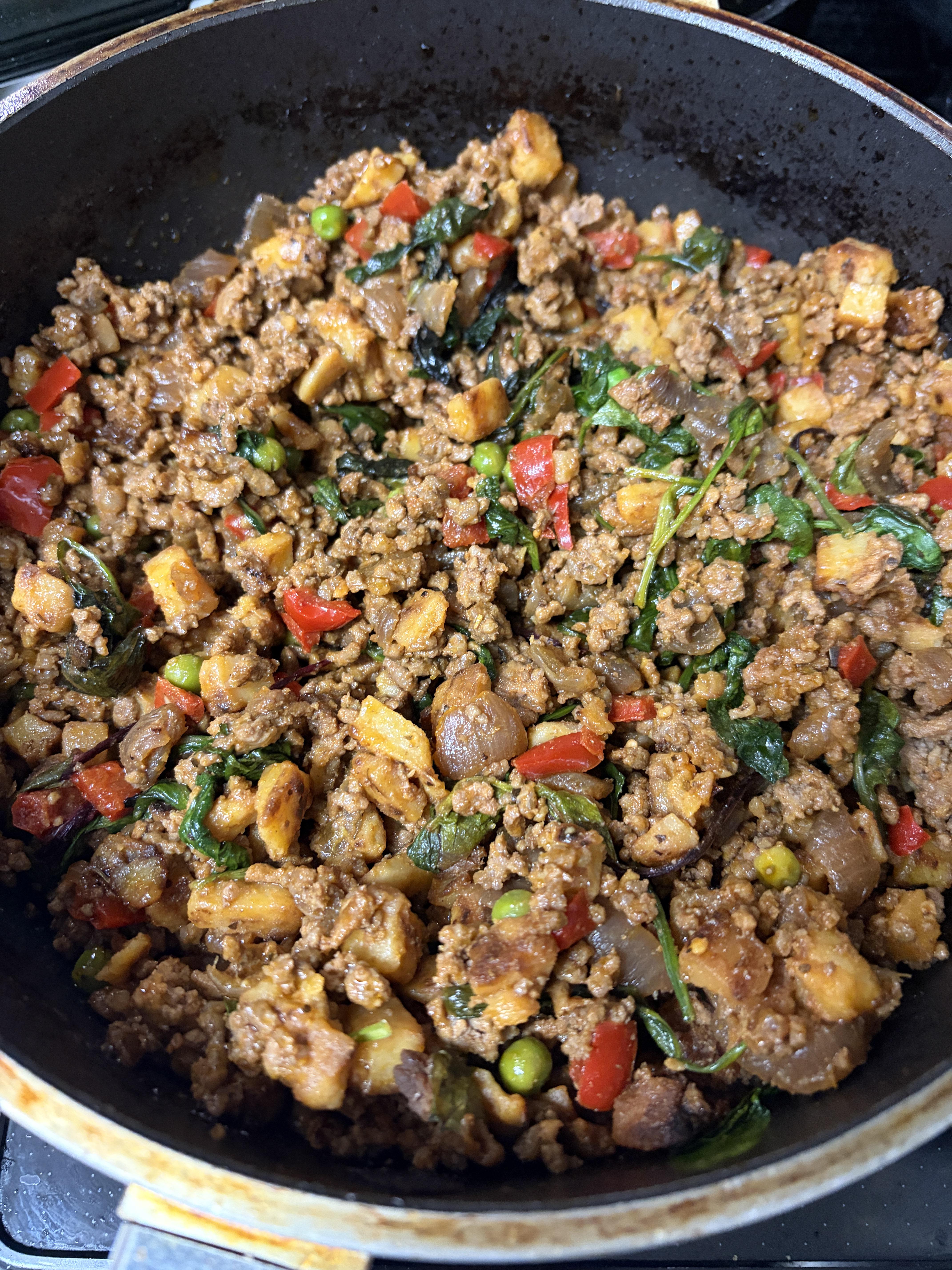 Return meat and potatoes to pan.