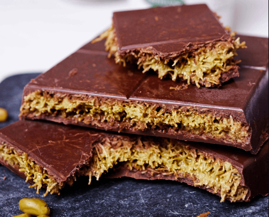 - Melt the white chocolate, milk chocolate, and oil in the microwave, then add it to the pistachio paste (you can use ready-made pistachio cream instead, but depending on the brand, the quantity may need adjusting).