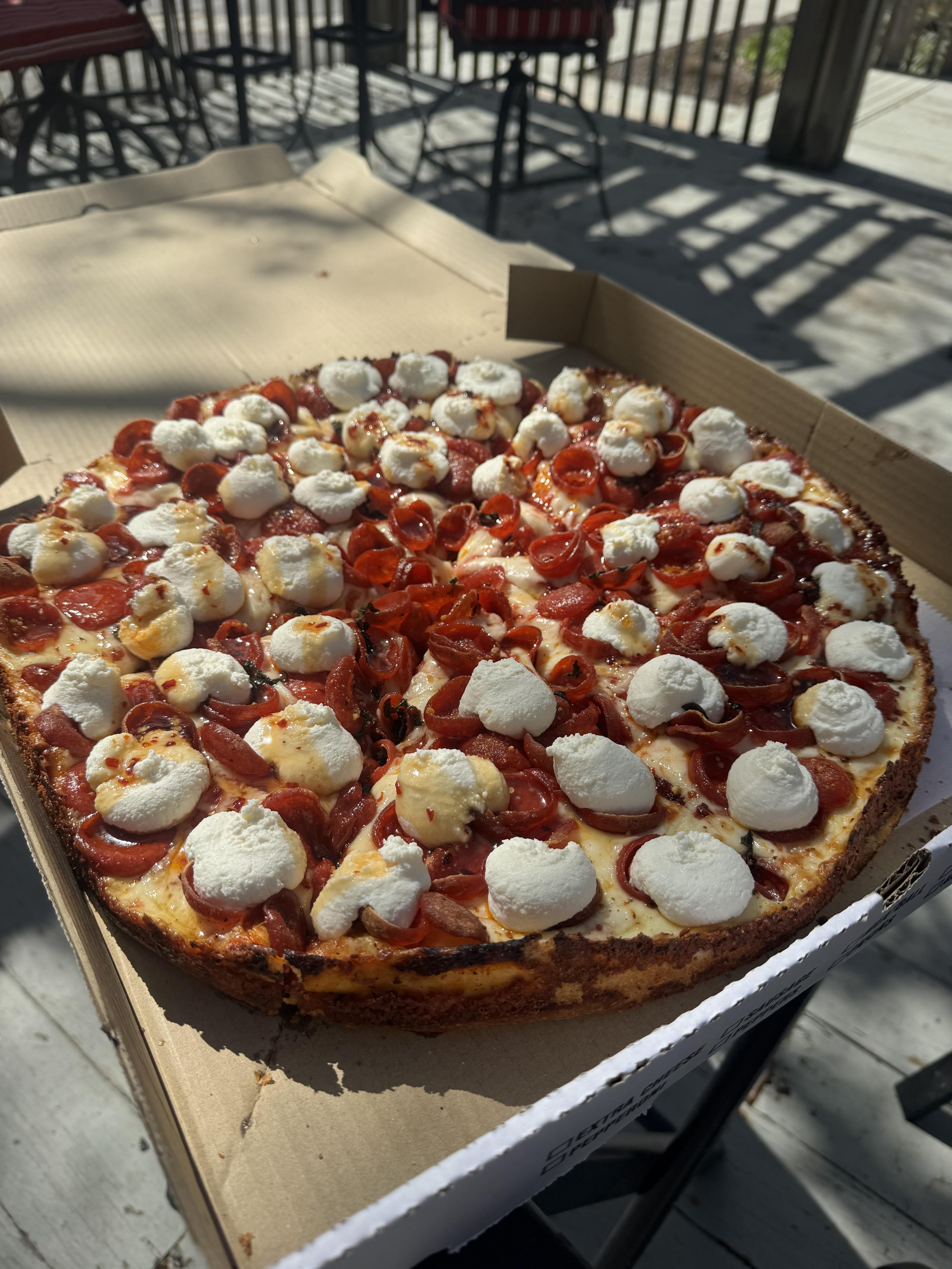 Crispy bottom, fluffy inside with a cheese baked edge topped with extra pepperoni, aged mozzarella, asiago, pecorino, basil, ricotta, oregano, and chili honey by Drama4YoLlama Food Porn