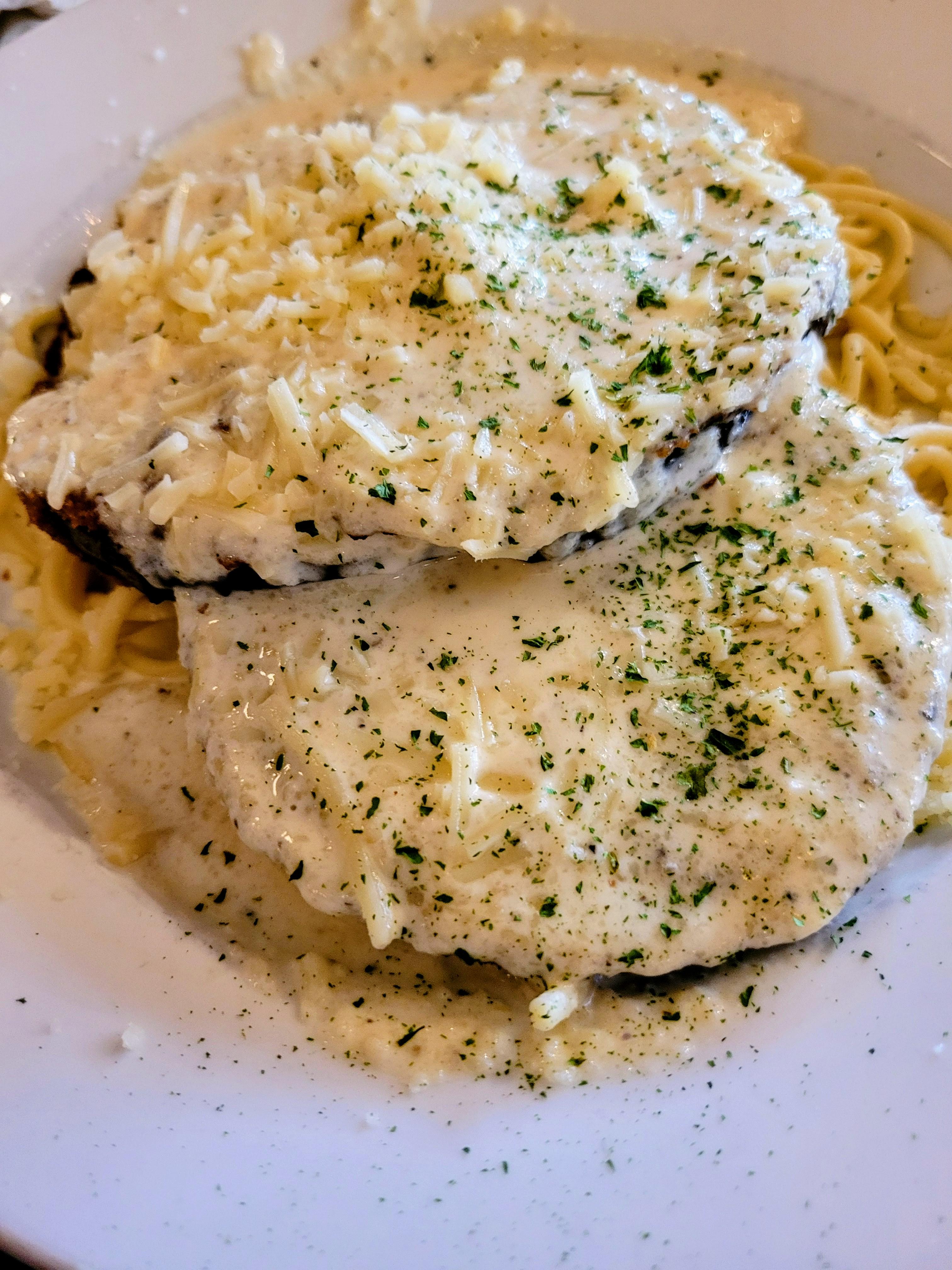 Fried eggplant topped with alfredo sauce on a bed of spaghetti noodles. by Lijey_Cat Dinner Tonight Tonight's Dinner