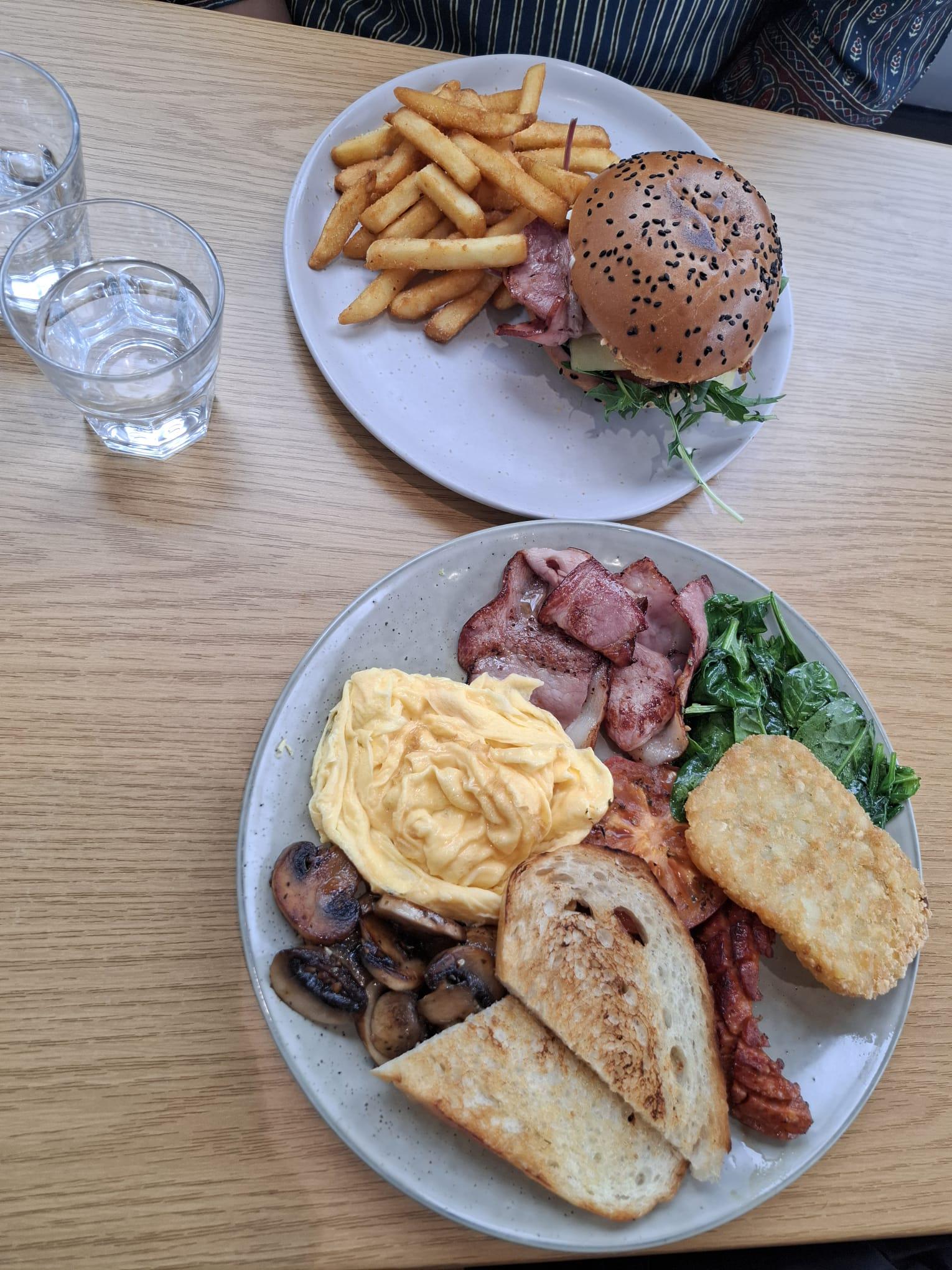 [I ate] scrambled eggs, beacons, mushroom, toasted bread and French fries with Burger, Canberra by Ok-Stick7199 Food