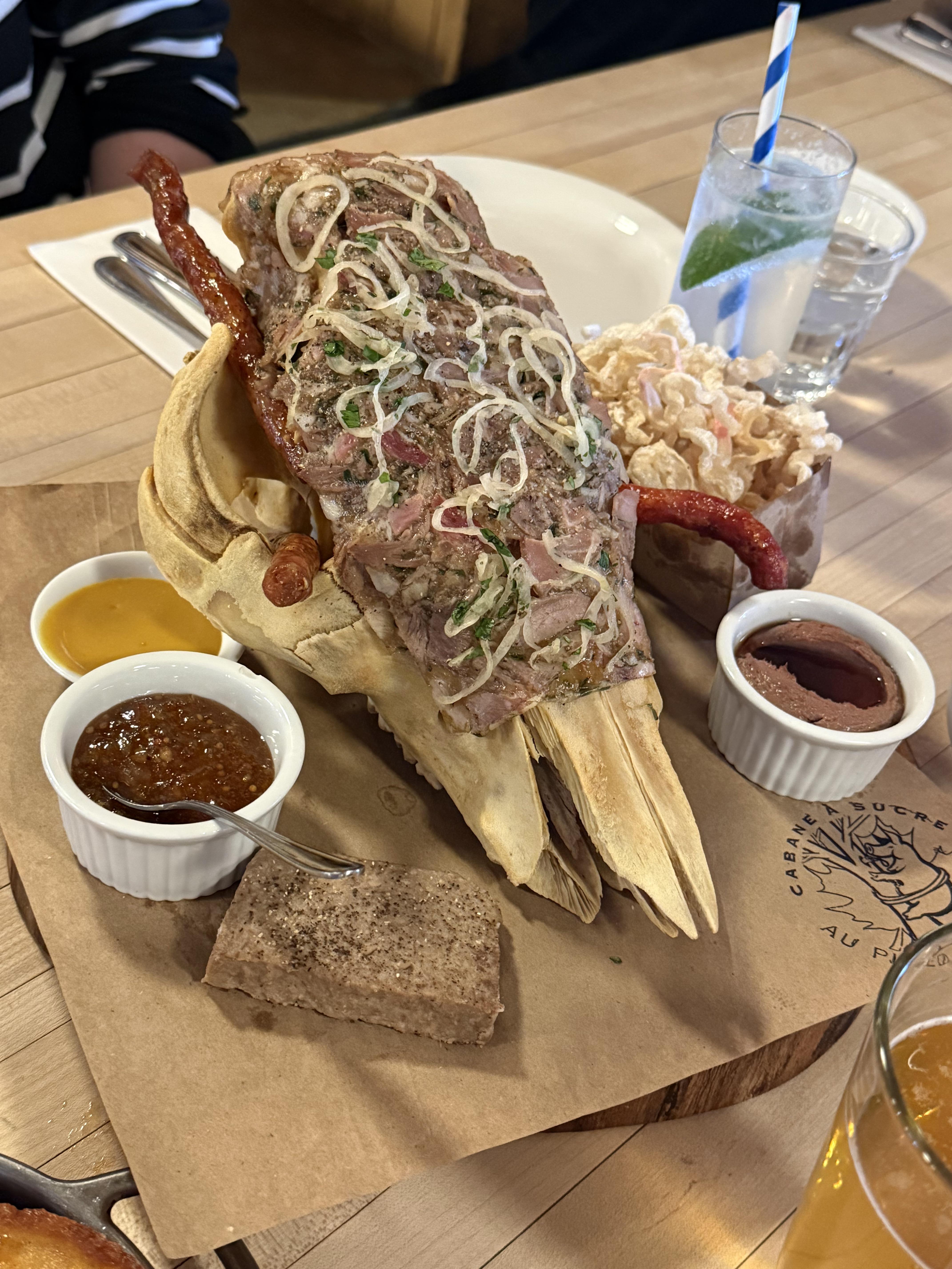 I ate headcheese on a head, well a skull technically. This was at Au Pied Du Cochon, a sugar shack in Mirabel, Quebec. A sugar shack (or Cabane a Sucre as itâs known locally) is an annual spring tradition that coincides with the running of maple sap. A meal based around maple syrup is served. In addition here we have a maple sausage, pate and chicken liver and fried maple pig skins. The headcheese was delicious.