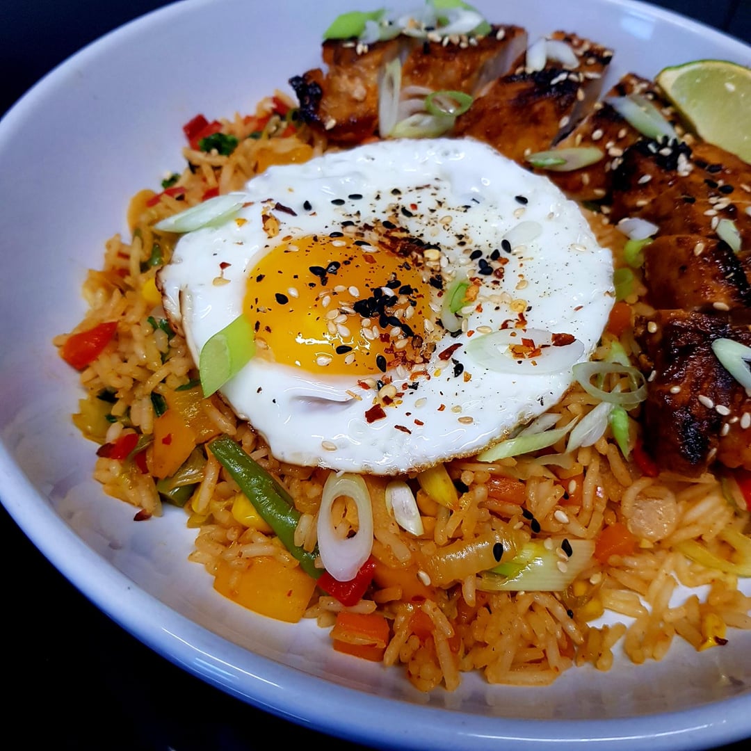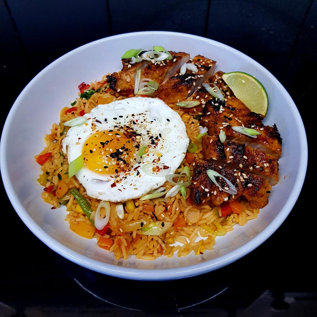 Spicy Gochujang Pork Belly, Korean Fried Rice and Fried Egg. Finished with Sesame Seeds and Gochugaru. Quick Midweek Meal. by pink_flamingo2003 Dinner Tonight Tonight's Dinner