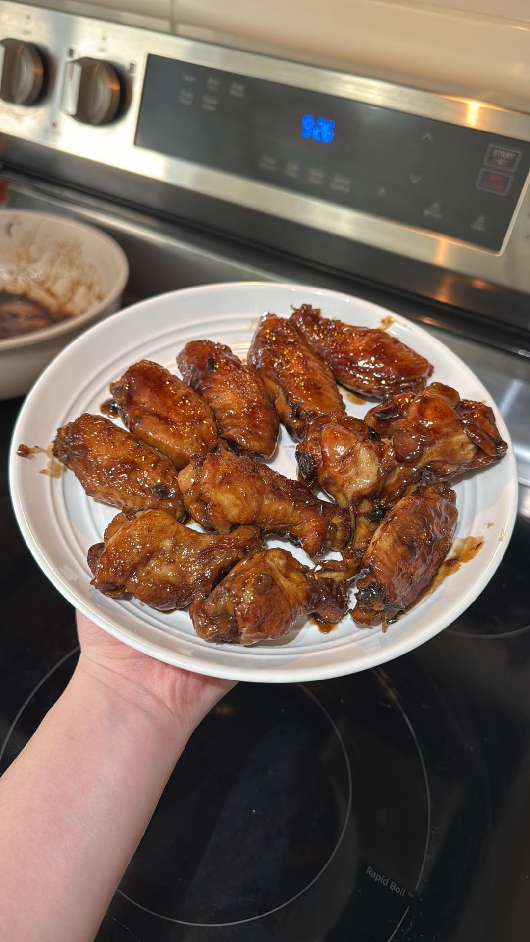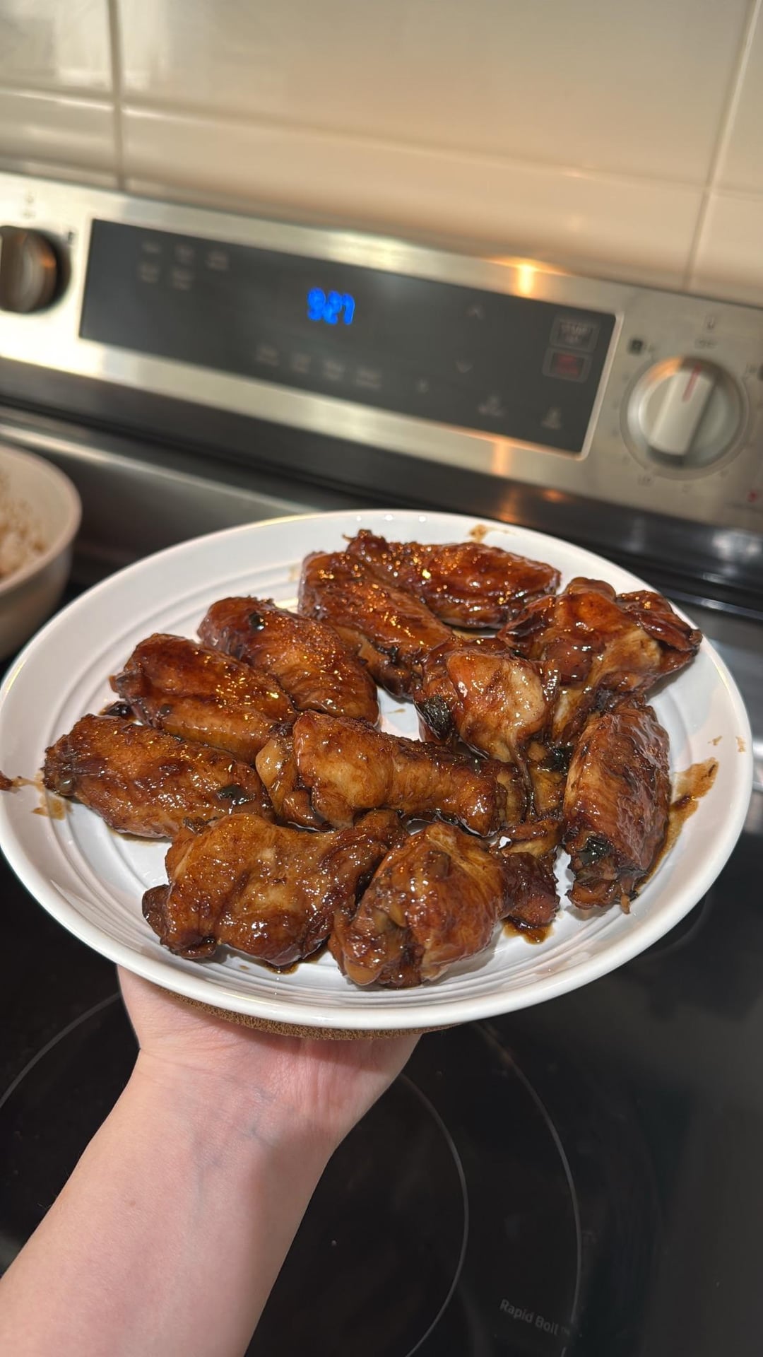 7.) Reduce glaze: remove the lid and turn the heat up to high. Let the sauce boil rapidly. Stir and flip the wings constantly for 3-5 minutes. The sauce will thicken into a dark, sticky, bubbly glaze.