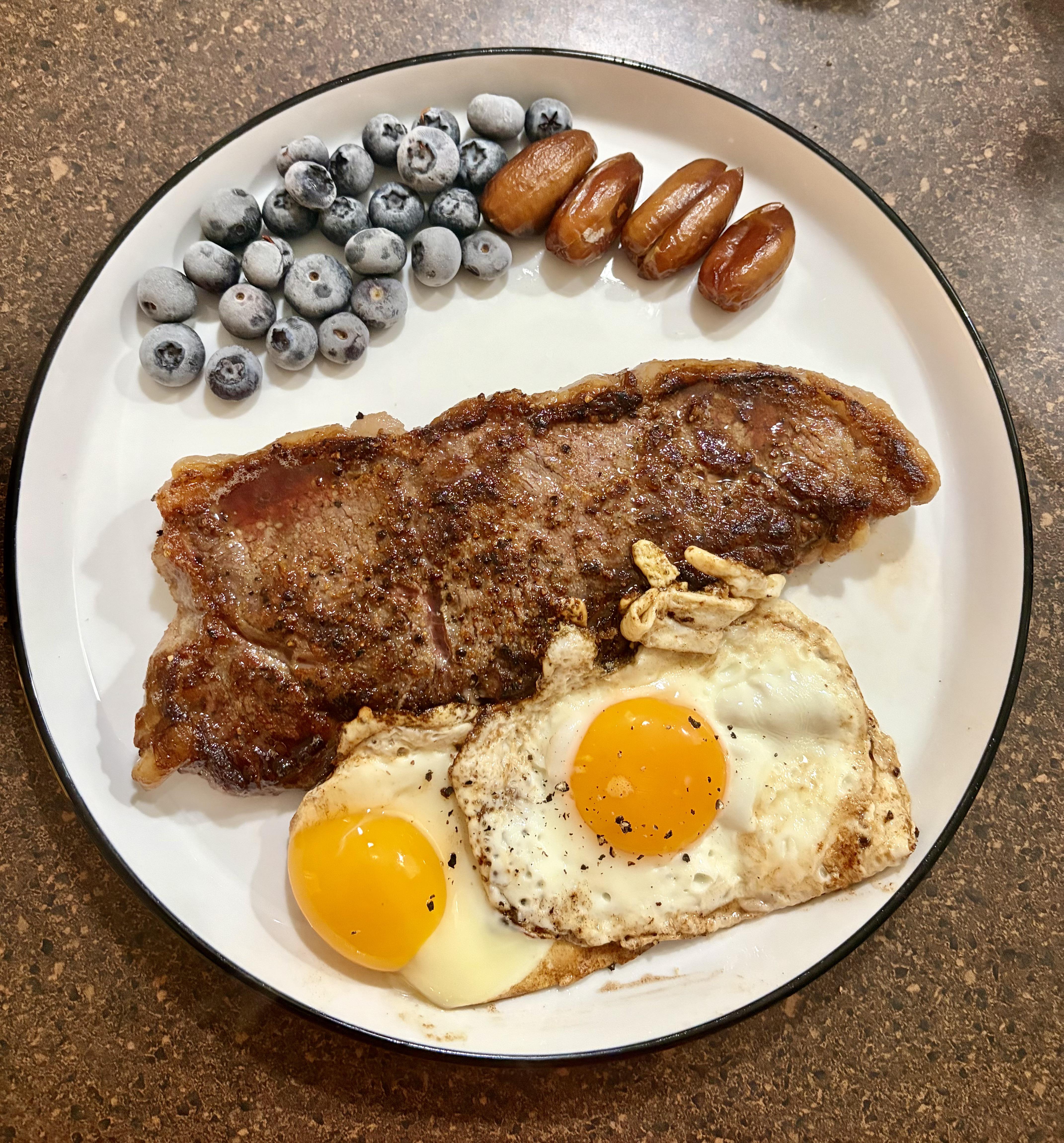 Dinner: grass fed NY strip and 2 pasture raised eggs with blueberries and dates on the side. All organic.