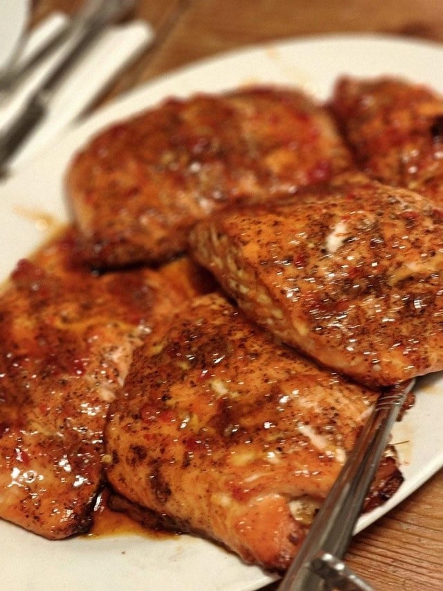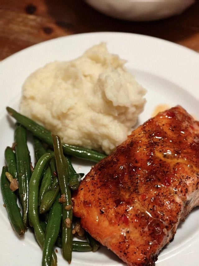 By request of my mom, roasted salmon with Cajun spices and sweet chili glaze, mashed potatoes and green beans with garlic by lighterliz Dinner Tonight Tonight's Dinner