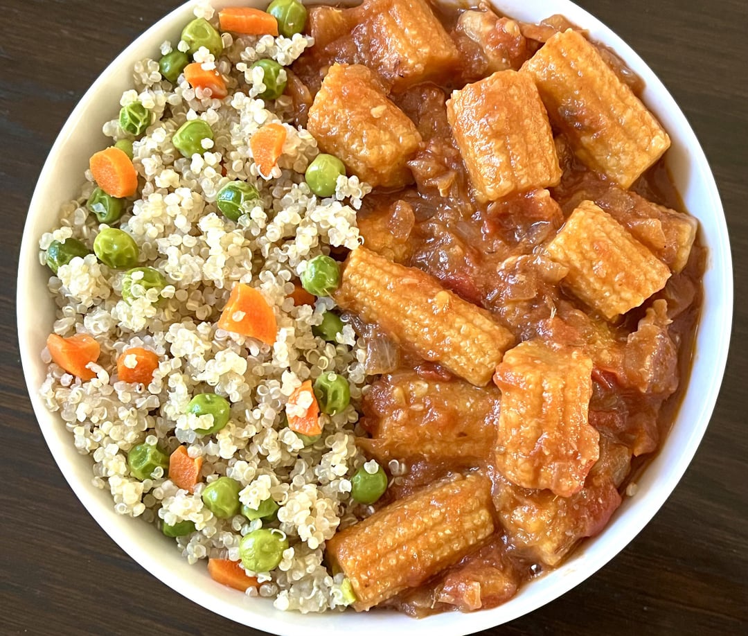 Well, here is the real intended title – ‘Quinoa with veggies and curried baby corn.’