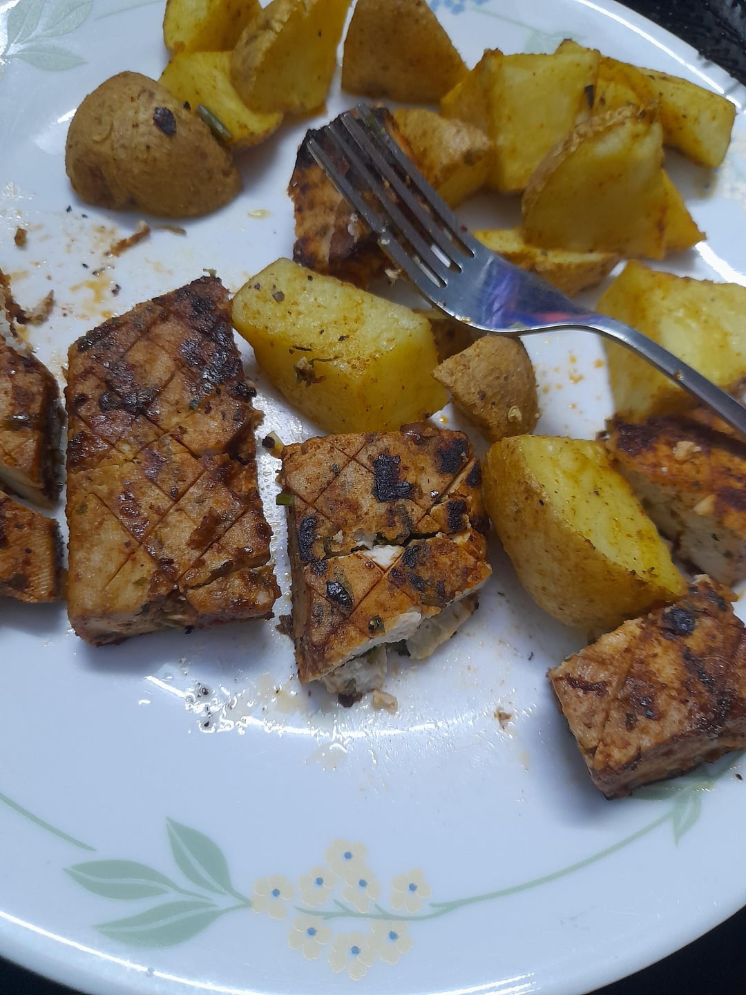 imthed0ct0r on May 6, 2023 5:26 pm Recipe: Tofu: -for the marinade I threw together a tbsp of pasta sauce, a good amount of soy sauce, fresh garlic, oil, and some seasoning -cut up your tofu into 4 rectangular blocks and make some slits on the surface with a knife -mix all the marinade ingredients together and properly cover your tofu with them -let sit for a couple of hours (optional) -cover a pan with oil and heat it up -grill for 2 minutes on each side. Make sure it doesn’t burn Potatoes: -Cut up 1 large or two small sized potatoes -Cover them with the juice of 1 lemon, salt and pepper, garlic, some oil and any one primary seasoning of your choice to give it flavour -Spread on a microwave safe dish and pop it in for 8 minutes