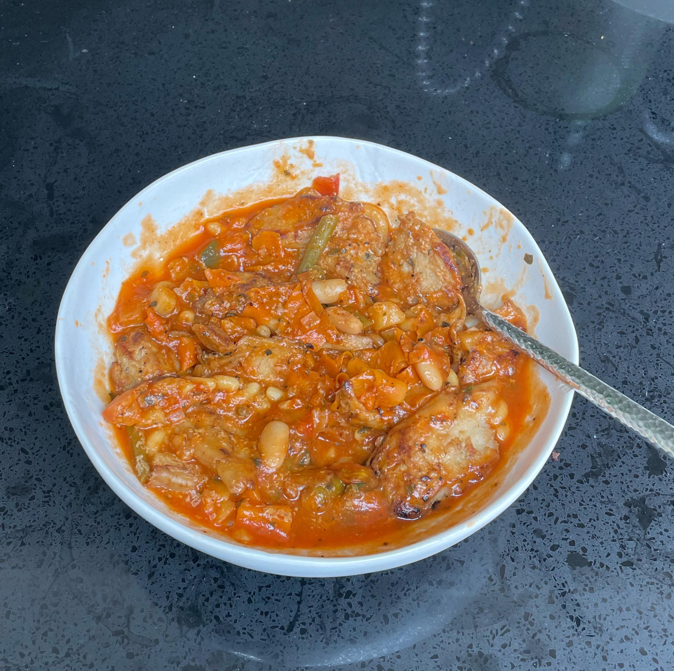 This is one portion pictured (in pasta bowl), recipe makes 2 portions: saute 110g Richmond vegan chicken pieces and 1/2 large carrot ribboned (with peeler) in pan with 30 sprays of rapeseed fry light. Microwave Tesco minestrone soup, combine both and add 2tbsp nooch, salt and pepper 👌🏻