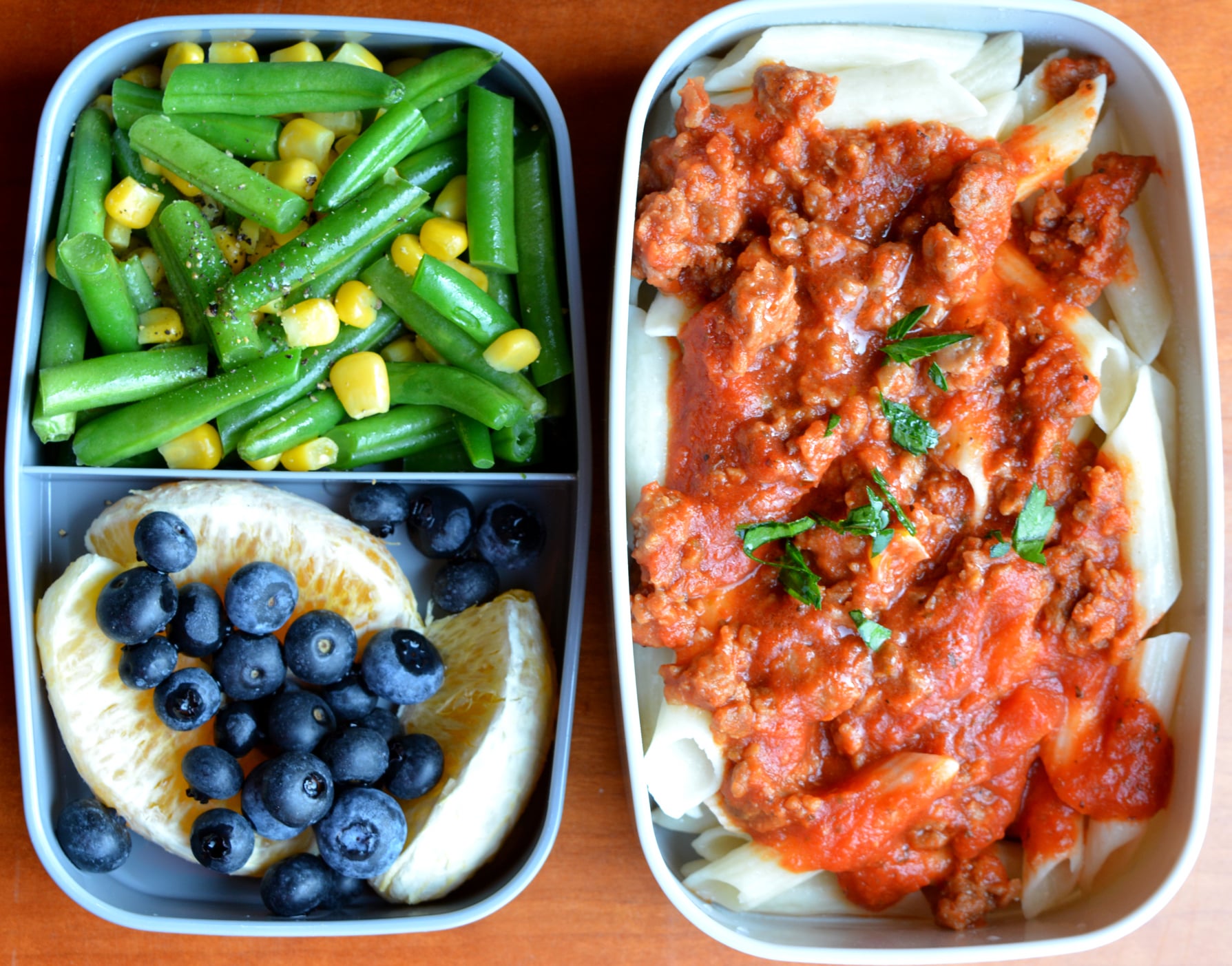 BeccaJ9382 on March 10, 2023 10:30 pm Bolognese sauce was super simple – 1/8 package of Beyond Meat pan fried with 6 T marinara sauce. Penne is Fiber Gourmet low calorie pasta. Veggies are corn and green beans microwaved with a little broth. Fruit is orange and blueberries.