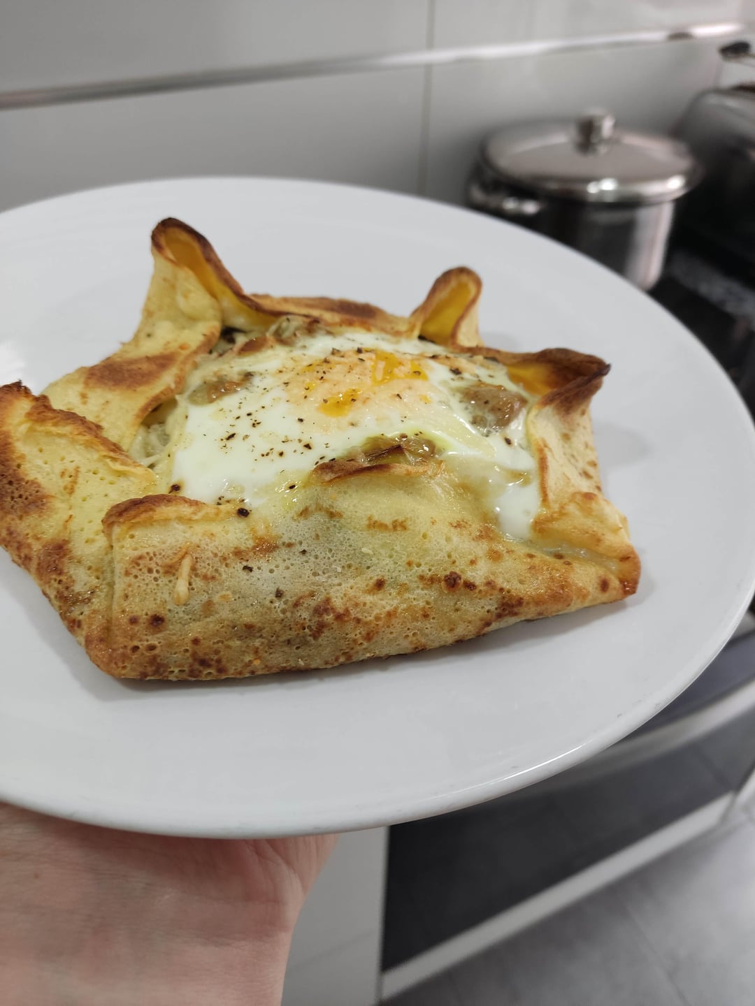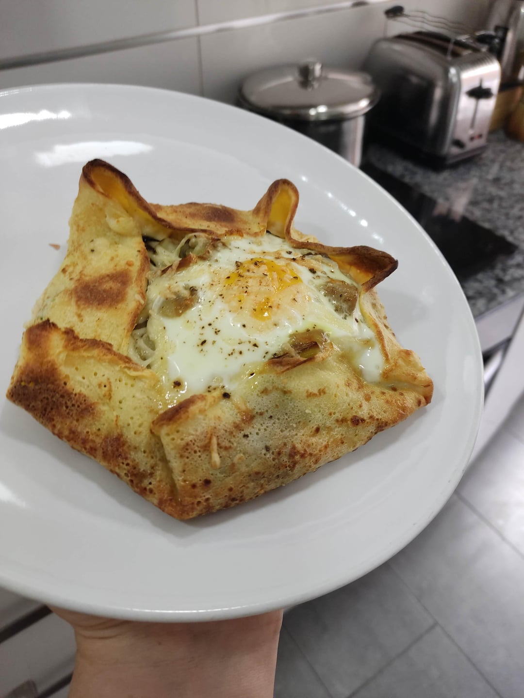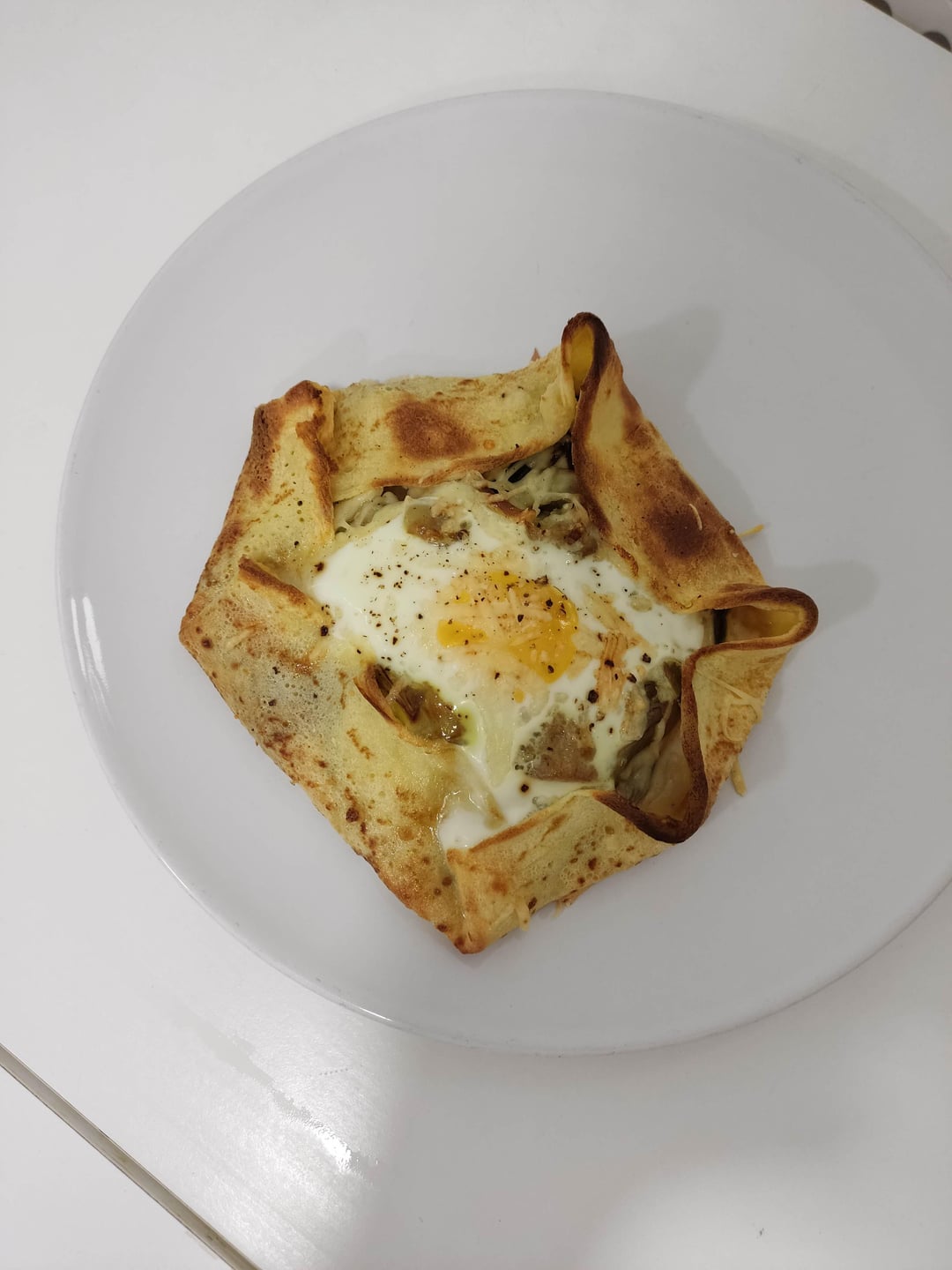 6. Fold the corners of the gallete to encase the ingredients. You can use a bit of bechamel to stick the corners down. Make a well and add an egg. Sprinkle with more cheese, season and add a splash of olive oil. Repeat the process.