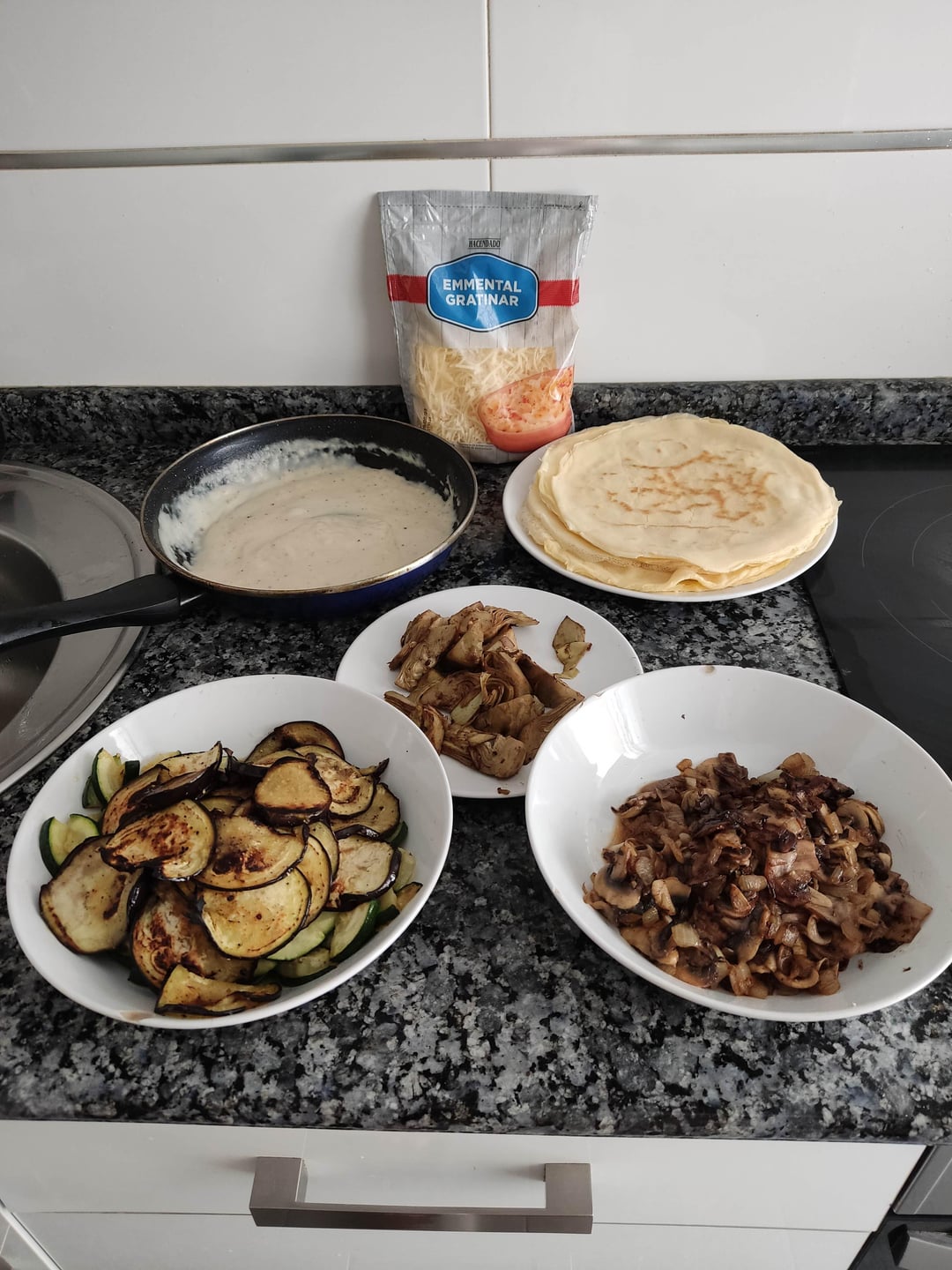 5. Preheat the oven to 180°C. On a baking tray, take a gallete and spread a tablespoon of bechamel across the whole diameter leaving an inch of pancake free. Add mushrooms and onions, some aubergine slices, some courgettes, and artichoke pieces. Sprinkle with cheese.