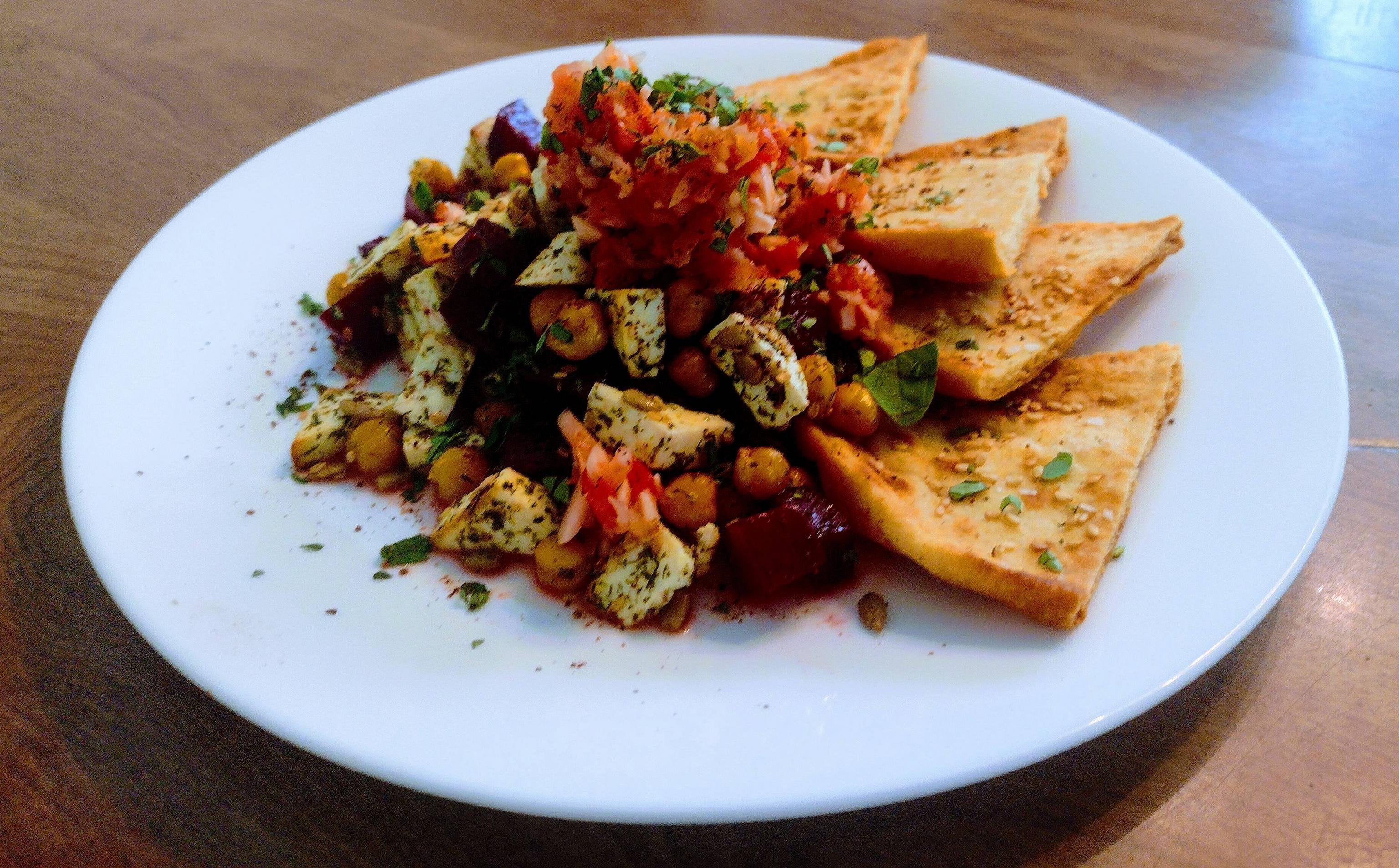 Soak a cup of dried chickpeas overnight. Simmer for about an hour or until desired firmness is reached. Drain and set aside. Cut half a block of paneer into small cubes. Combine with chickpeas, a dash of olive oil, salt , pepper, sesame seeds and some dried dill. Roast in oven for 20 minutes or so.