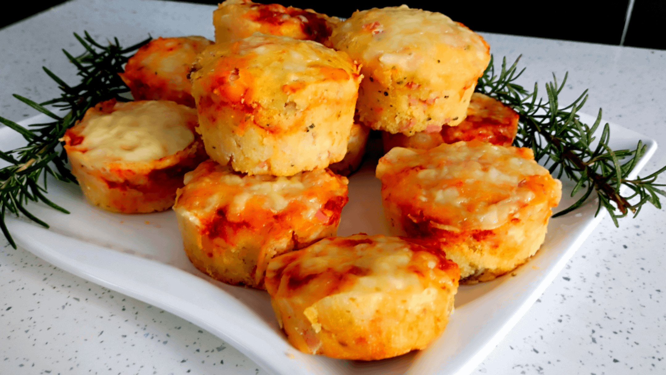 Take a glass bowl, put eggs and salt and mix them well. Then add yogurt, olive oil, flour and mix well to combine the ingredients. Then add corn flour and continue mixing. After mixing the corn flour, add oregano, baking powder, mushrooms and pizza ham and continue mixing. Then add half of the cheese and mix for another 2-3 minutes to combine the ingredients well. The mixture is now ready to fill the muffin pan. We take a muffin pan and coat it with olive oil and then continue filling the muffin pan with the mixture. We fill them half and then add tomato sauce and cheese.