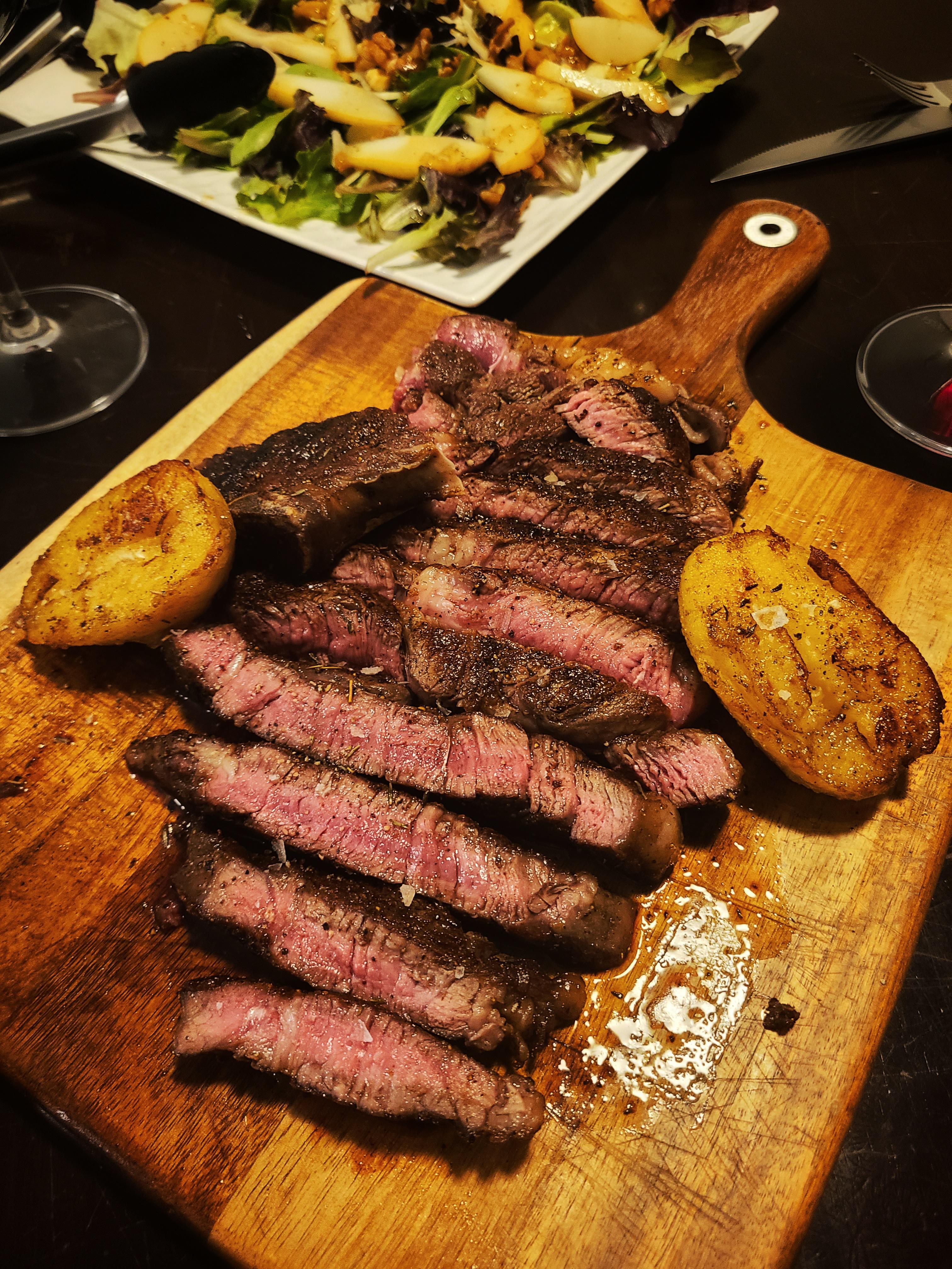 Pan Seared Pork Steak with Apple Cider Sauce and Caramelised Apples. Served with Gratin and Sautéed Brocolli. Finished with Crispy Sage Leaves.
