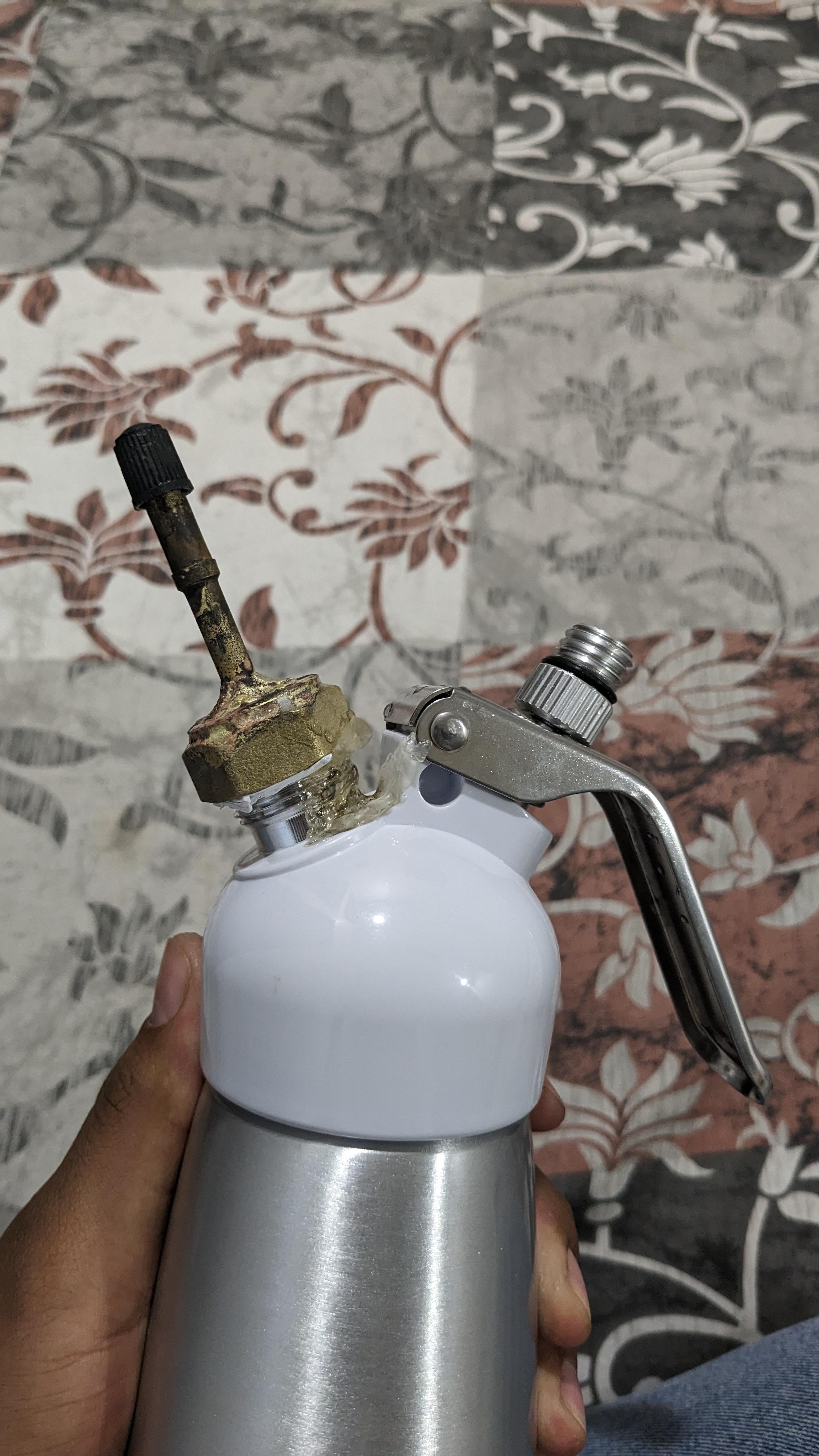 added an attachment to fil air from regular air pump. I tried searching it online but no one had done it in past. inch air conditioner dummy nut 1 car air valve Teflon Hot glue to cover the hole near the neck It works but haven’t tested with wipping cream yet, with my calculations it requires 11-22 ATM of air somewhere around 150-300psi
