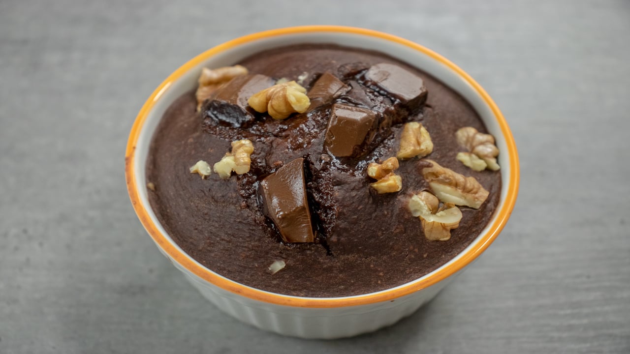 Add all the ingredients except the chocolate chunks and the nuts into a blender and blend. add the mixture into a ramekin and top up with chocolate and nuts. bake on a preheated oven at 180 C – 350 F for 15- 18 mins