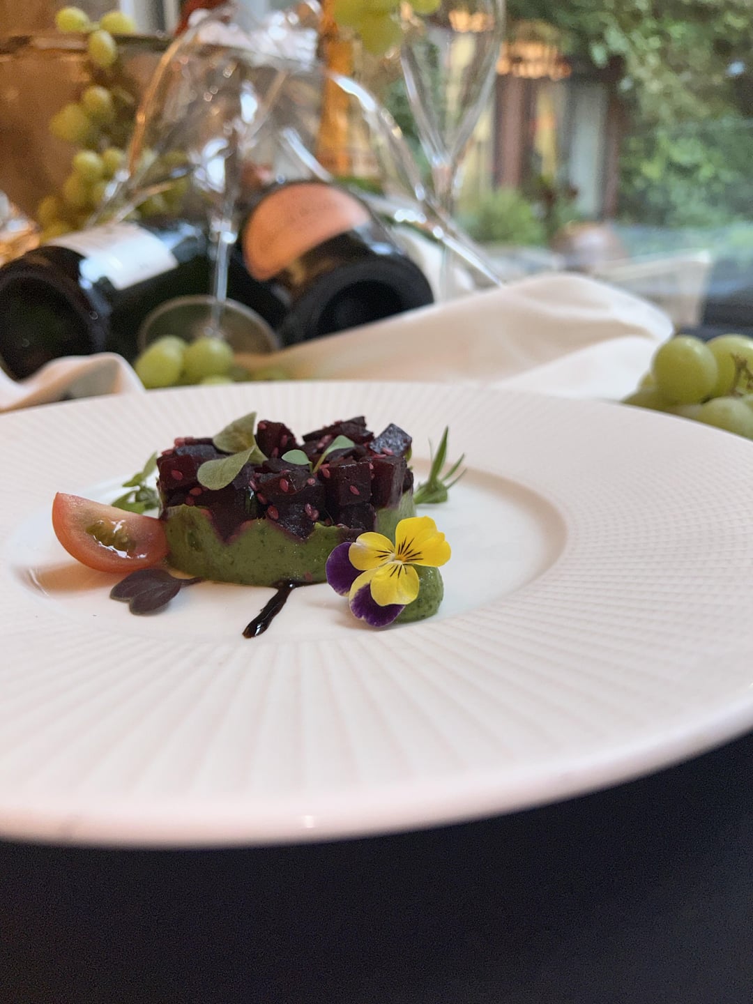 Puree 4 ripe avocados with half a lime juice and zest, 2 cloves of garlic, salt, pepper, 1tbsp fresh chives and 1tbsp modified starch to slightly thicken the cream. Dice beetroots and fry them in sesame oil with toasted sesame seeds. Use a smoke gun to smoke the fried beets, let it rest in smoke for half an hour. Pipe the avocado cream in a pastry ring, top it with the beetroot. Remove the pastry ring and decorate the plate.