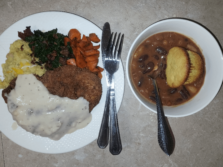 Fried Porkchop, White Gravy, Shrimp & Green Chili Cheddar Grits, Kale w/ Chorizo, Agave Carrots, Chili Beans, Corn Bread